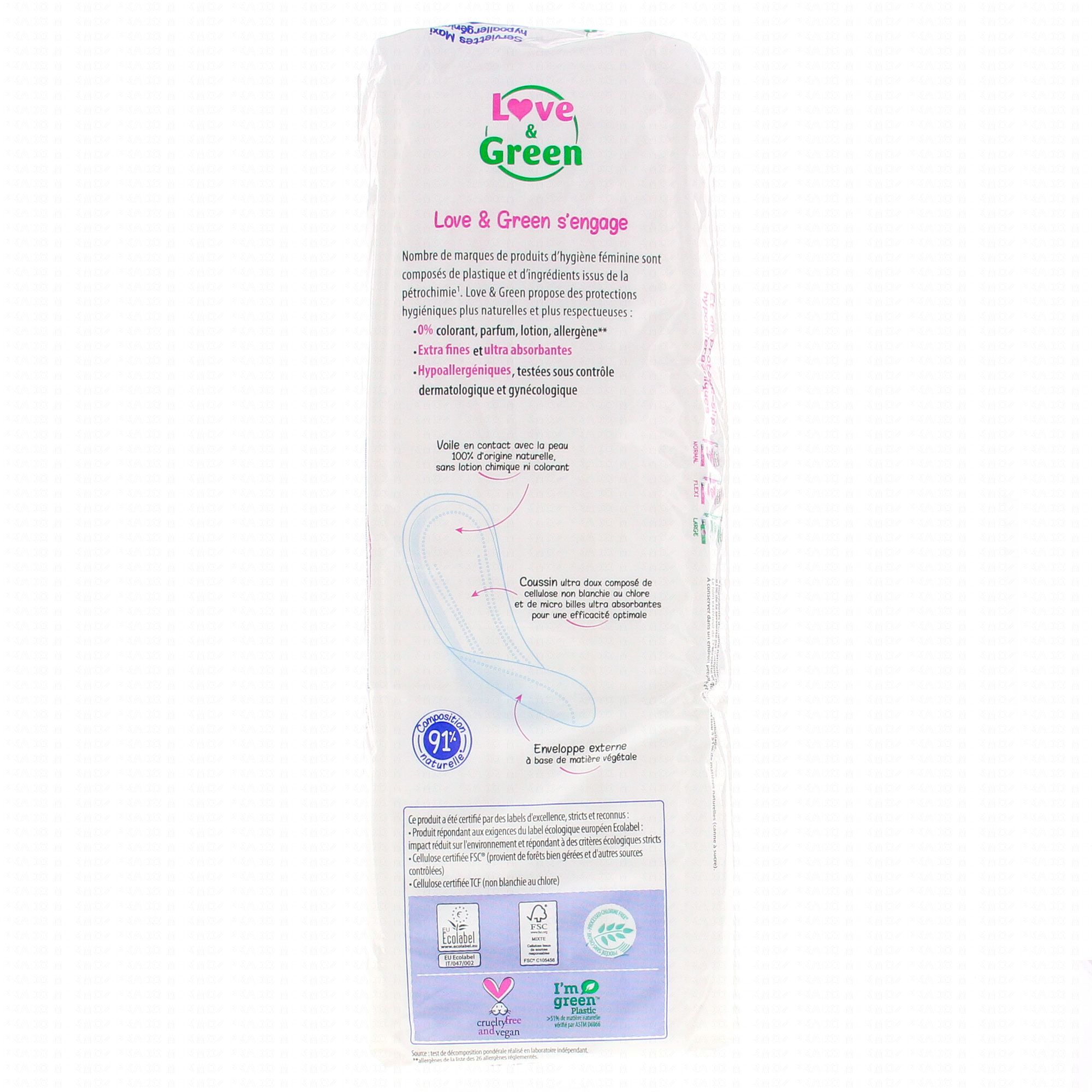 Sans plastique ni composé issu de la pétrochimie, les serviettes Love & Green sont garanties sans parfum, sans lotion et sans allergènes. Elles sont sans danger pour votre santé et ne contiennent aucun perturbateur endocrinien.