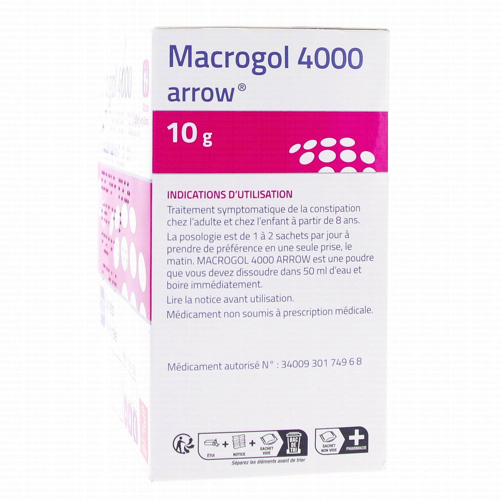 Classe pharmacothérapeutique : laxatif osmotique - code ATC : A06AD15. MACROGOL 4000 ARROW contient la substance active macrogol 4000 et appartient à un groupe de médicaments appelés laxatifs osmotiques. Il permet d'augmenter la quantité d'eau dans les matières fécales, ce qui aide à résoudre les problèmes liés à un transit intestinal ralenti. MACROGOL 4000 ARROW n'est pas absorbé dans la circulation sanguine et n'est pas modifié dans l'organisme. MACROGOL 4000 ARROW est indiqué pour le traitement de la constipation chez l'enfant âgé de 6 mois à 8 ans. Ce médicament se présente sous forme d'une poudre qu'il faut dissoudre dans un verre d'eau et boire. Son effet se manifeste généralement en 24 à 48 heures. Le traitement de la constipation par un médicament doit être associé à des règles d'hygiène de vie et à une alimentation saine.