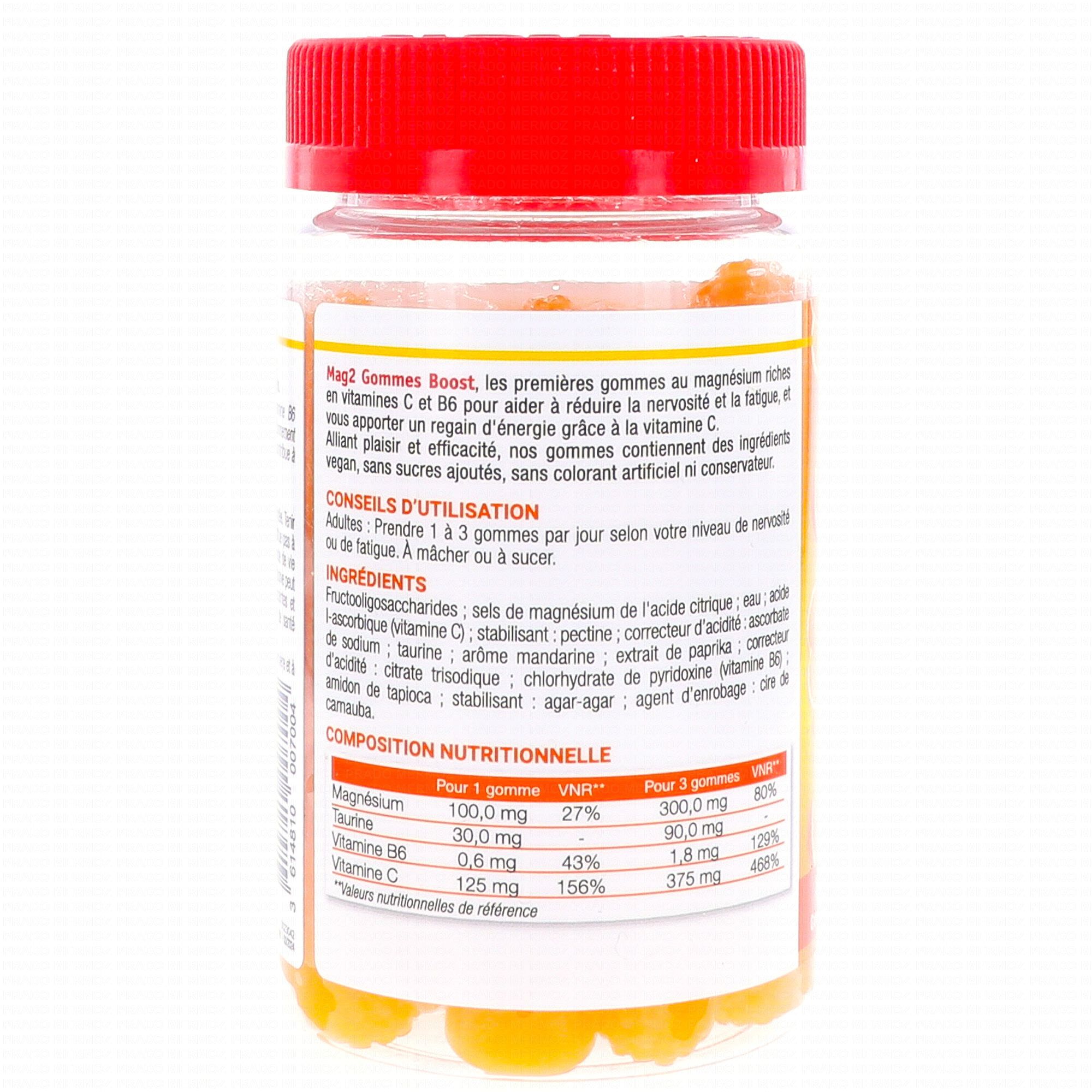 MAG 2 Boost Energie Nervosité x45 Gommes est un complément alimentaire qui favorise le fonctionnement normal du système nerveux grâce à la présence de Magnésium. La Taurine appuie la performance physique et mentale en cas de stress temporaire. La vitamine C aide à réduire la fatigue.