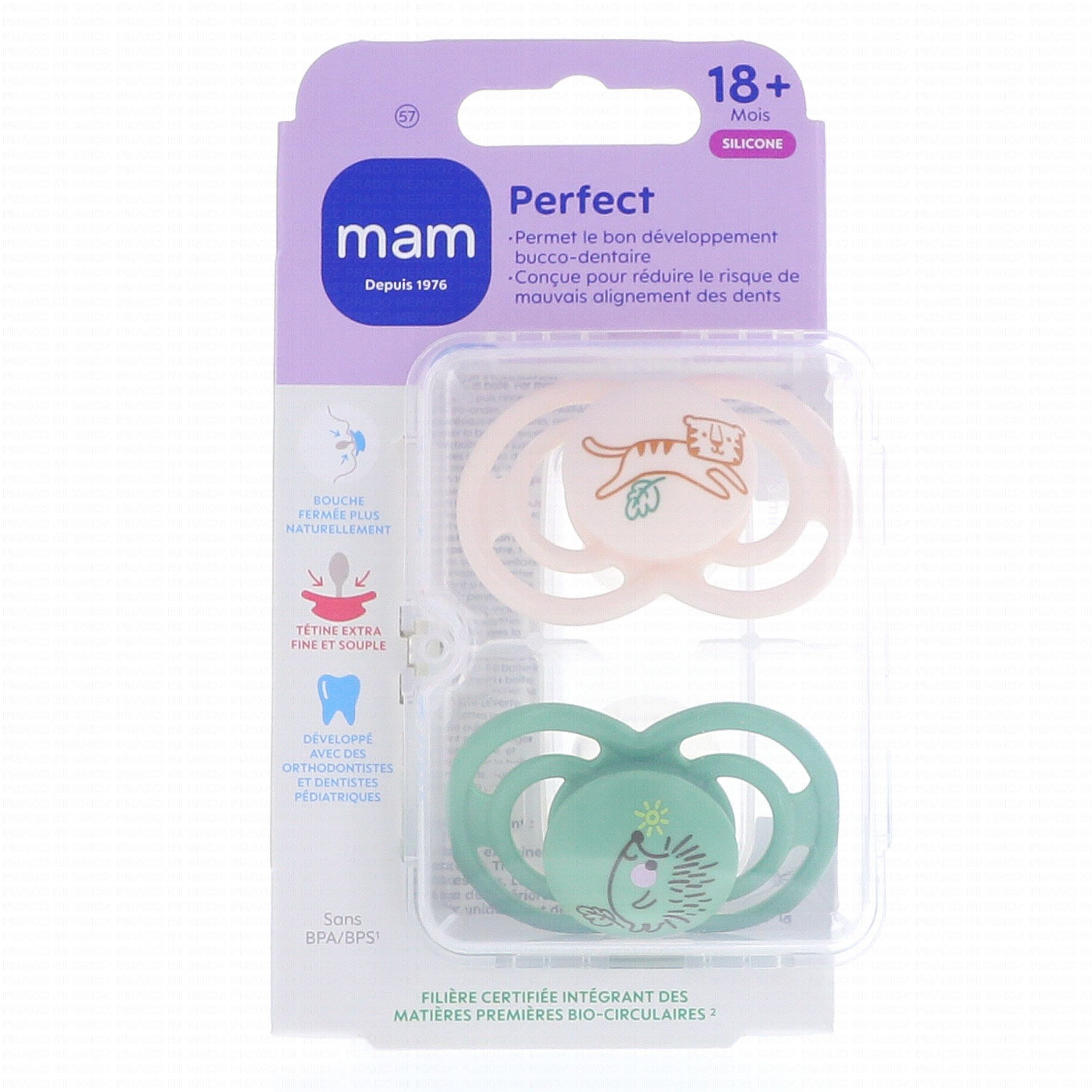 MAM 2 Sucettes Perfect Silicone 18 Mois et + est une sucette développée afin de réduire les risques de mauvais positionnement des dents chez les enfants de 18 mois et plus.