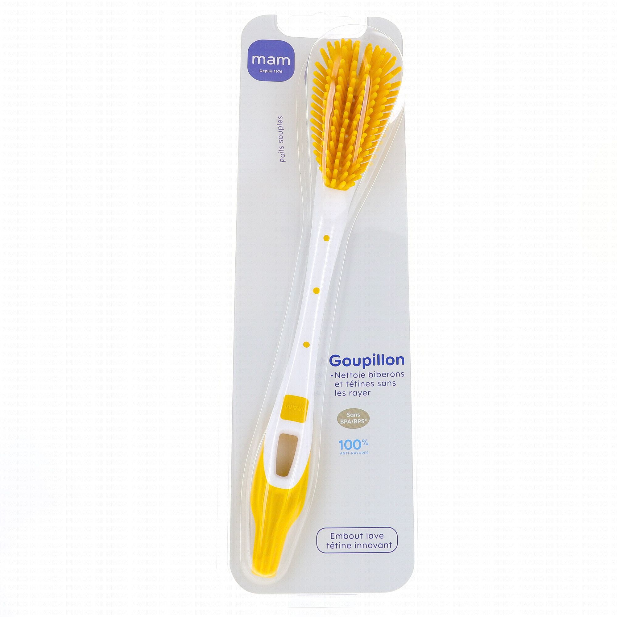 Soies ultra-souples, design et anti-rayure. Le goupillon MAM permet de nettoyer facilement biberon et tétine. Forme adaptée aux tétines plates MAM. Coloris : bleu ou vert.