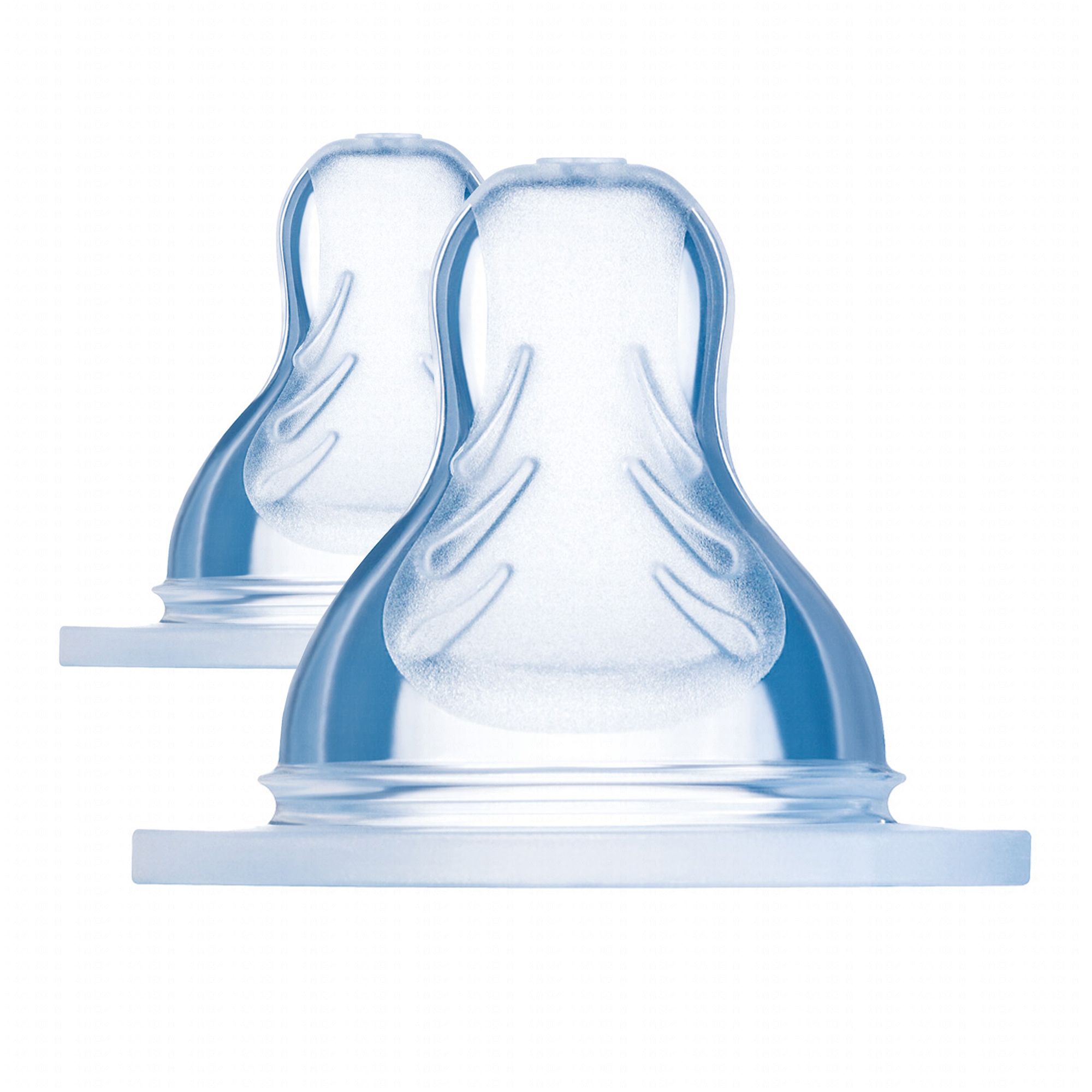 Tétine plate en silicone. Forme anatomique pour les nourrissons de plus de 2 mois. Débit 2 moyen.