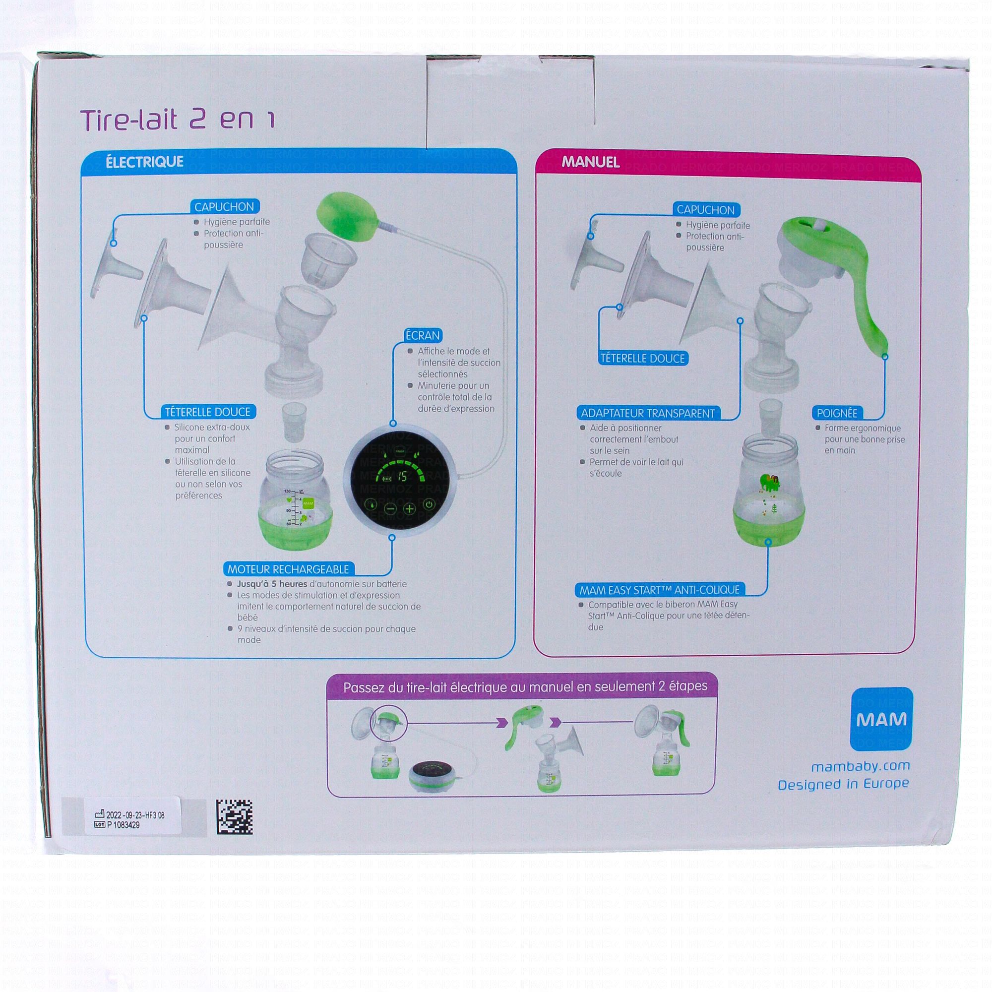 MAM Tire-Lait 2 en 1 est un pack qui permet un double usage, manuel ou électrique, pour une flexibilité maximale et une expression du lait efficace et en douceur.