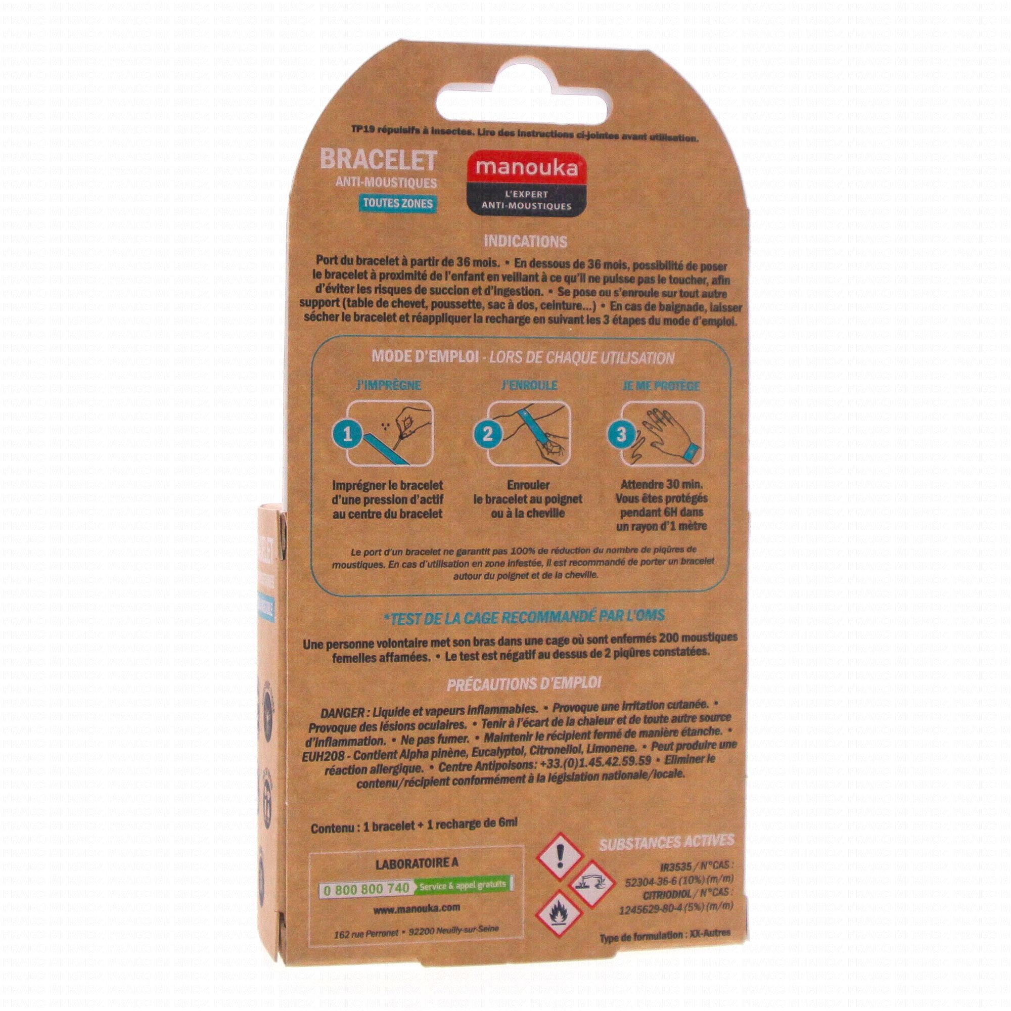 En un clic, le bracelet s'adapte à votre poignet. Le bracelet anti-moustiques MANOUKA permet d'être protégé contre les moustiques normaux et tigres, cliniquement prouvé par le test de la cage. Chaque bracelet contient une fiole de recharge contenant le répulsif pour une durée de protection d'un mois environ.