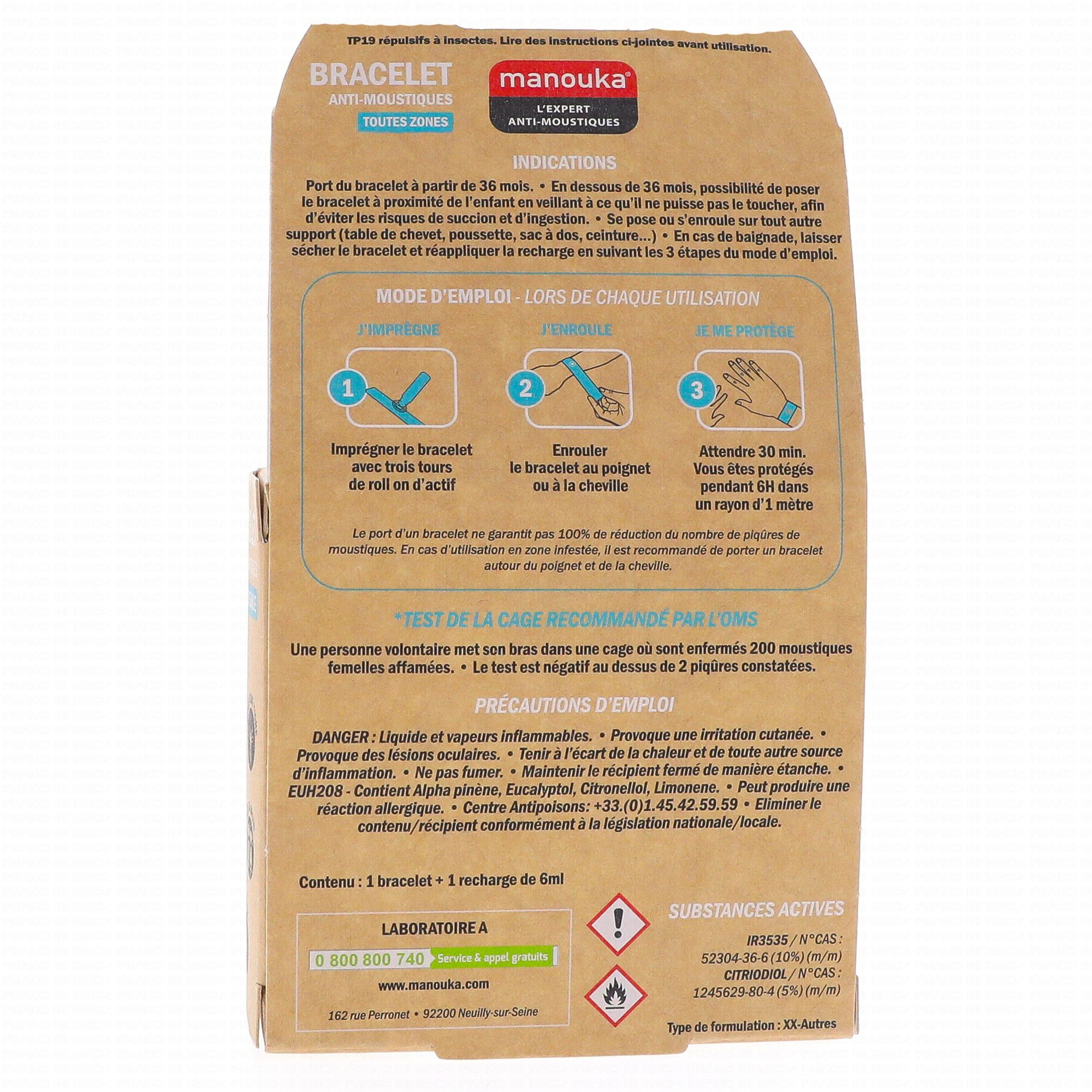 En un clic, le bracelet s'adapte à votre poignet. Le bracelet anti-moustiques MANOUKA permet d'être protégé contre les moustiques normaux et tigres, cliniquement prouvé par le test de la cage. Chaque bracelet contient une fiole de recharge contenant le répulsif pour une durée de protection d'un mois environ.