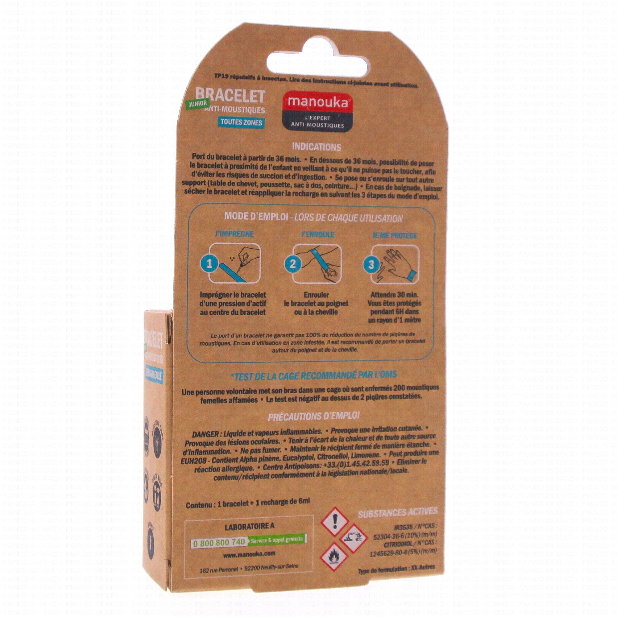 En un clic, le bracelet s'adapte à votre poignet. Le bracelet anti-moustiques MANOUKA permet d'être protégé contre les moustiques normaux et tigres, cliniquement prouvé par le test de la cage. Chaque bracelet contient une fiole de recharge contenant le répulsif pour une durée de protection d'un mois environ.