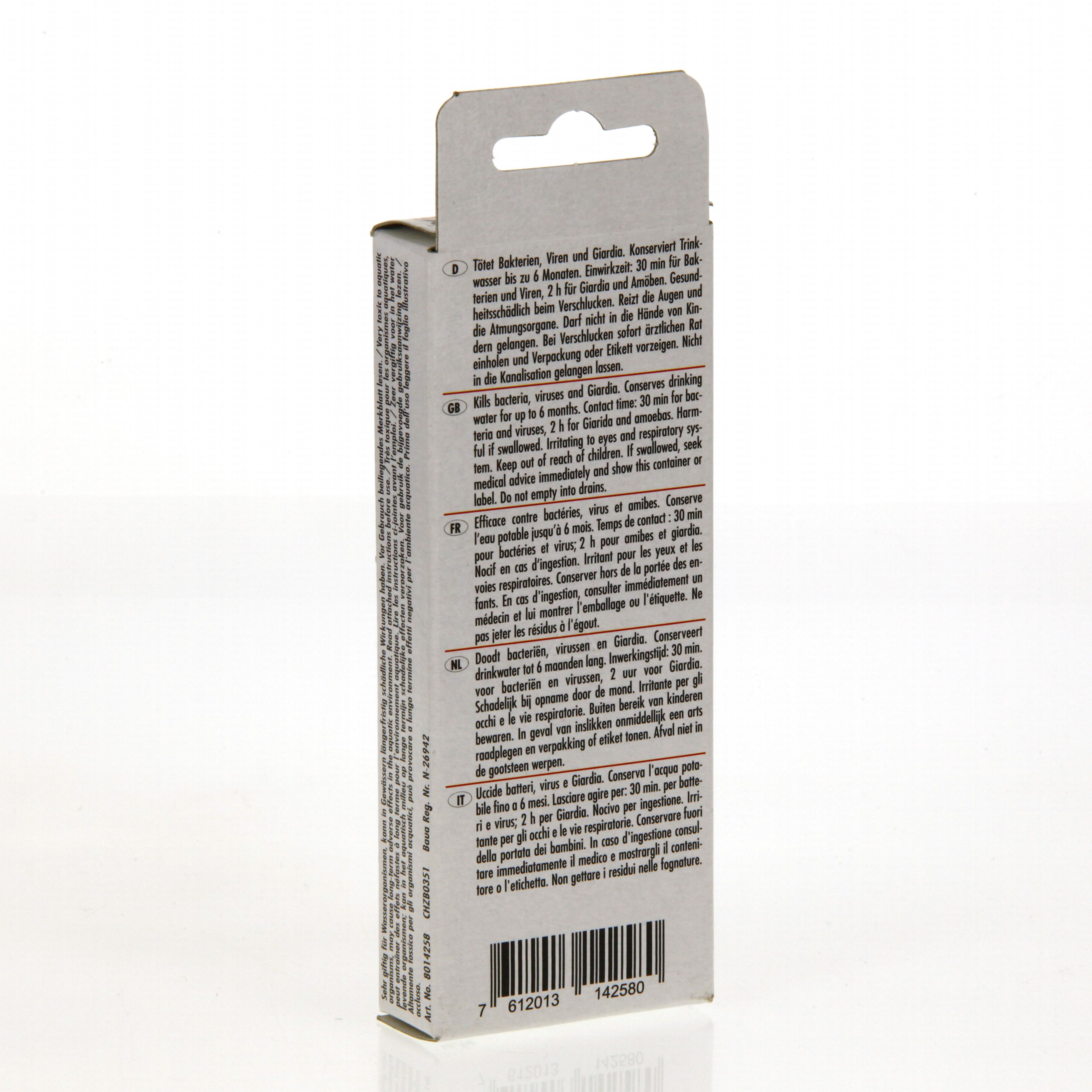 1 comprimé pour traiter 1 litre d'eau. Temps de contact 30 minutes minimum (virus et bactérie), 2 heures pour les amibes et giardia. A utiliser sur eau claire. En cas d'eau trouble, utiliser un système de microfiltration.