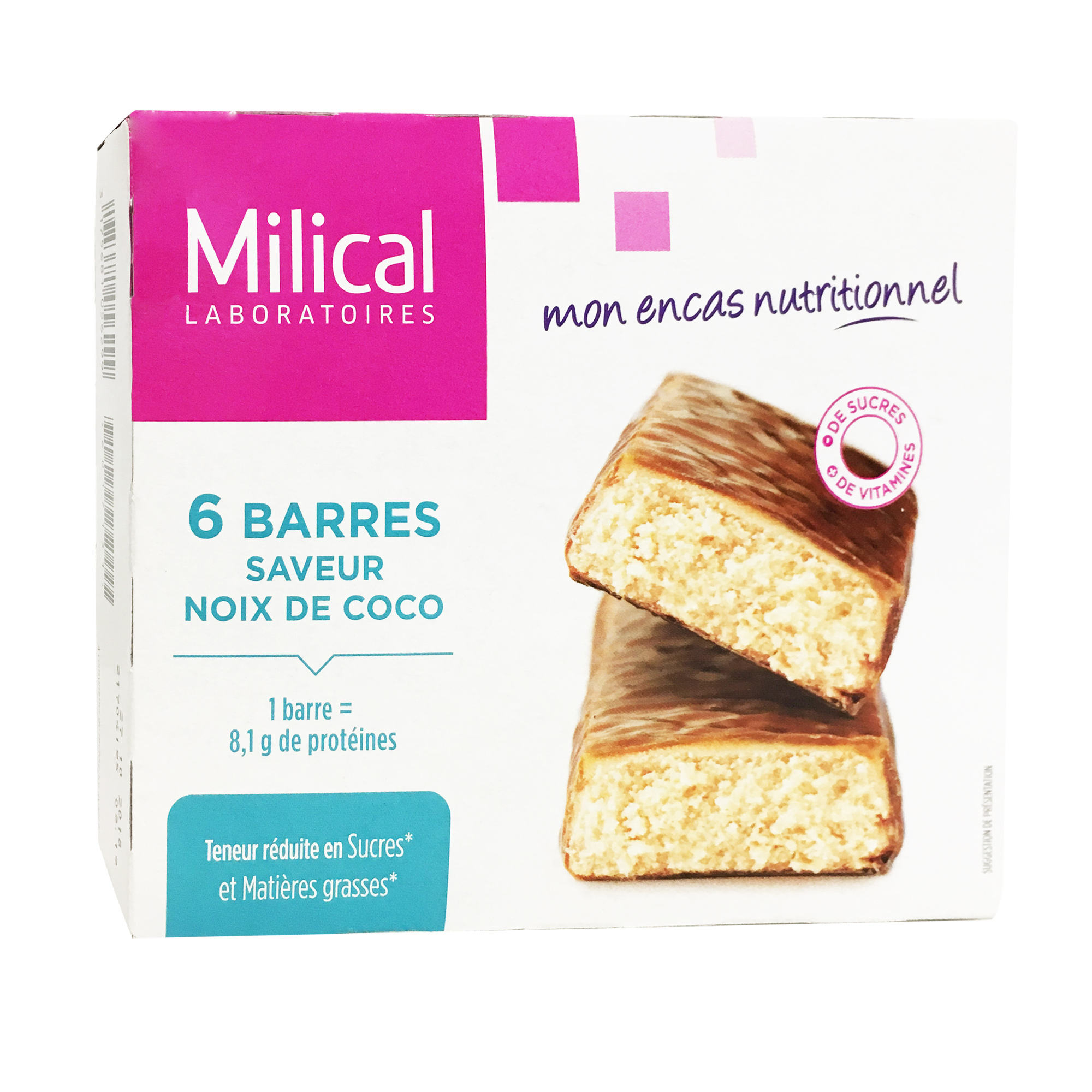 MILICAL Barre hypocalorique saveur coco boites de 6 barres est un encas hypocalorique, riche en protéines, appauvri en glucides et en lipides, riche en calcium, magnésium, fer et en vitamines B1, B6, C et E.