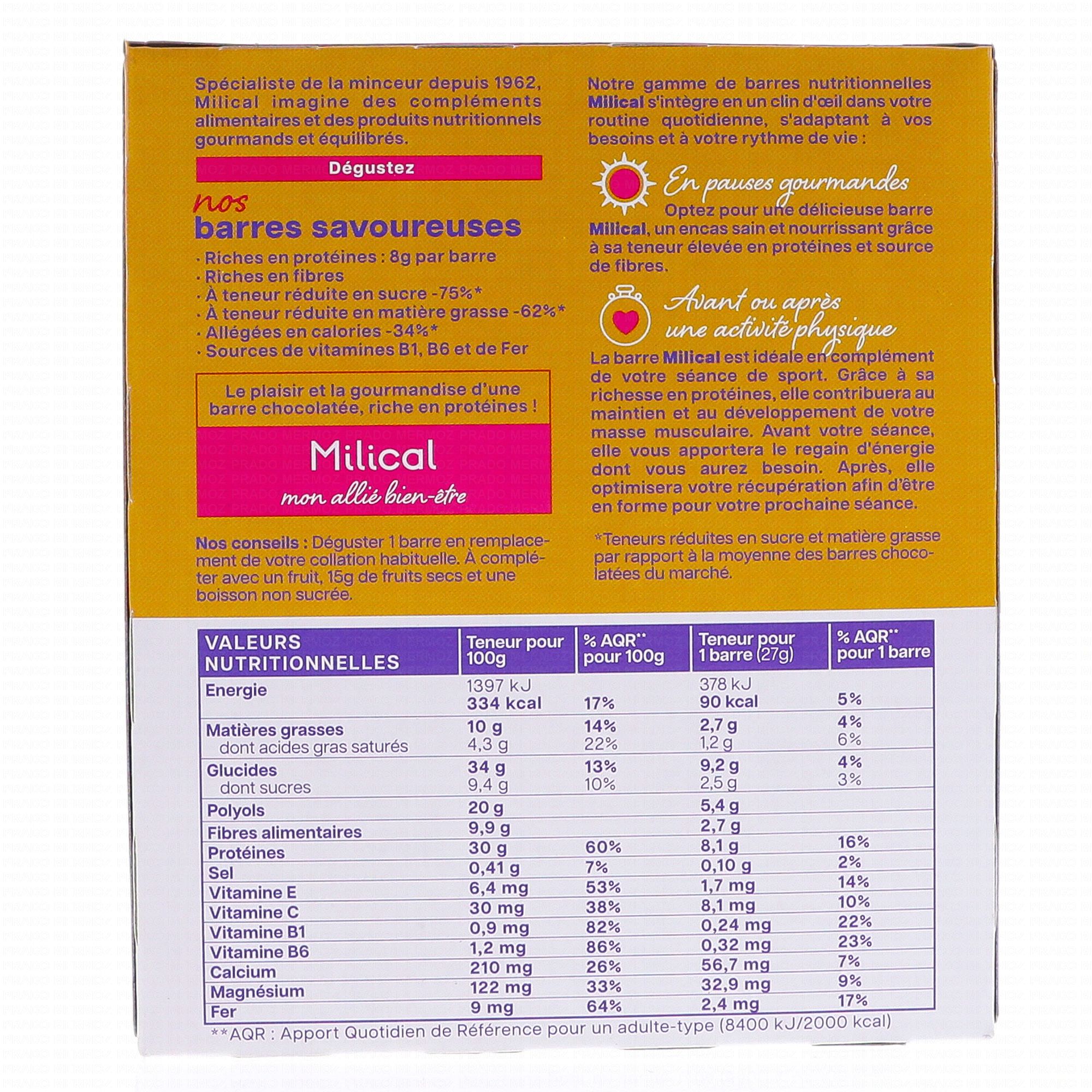 MILICAL Barre hypocalorique saveur vanille boites de 6 barres contient les éléments suivants :