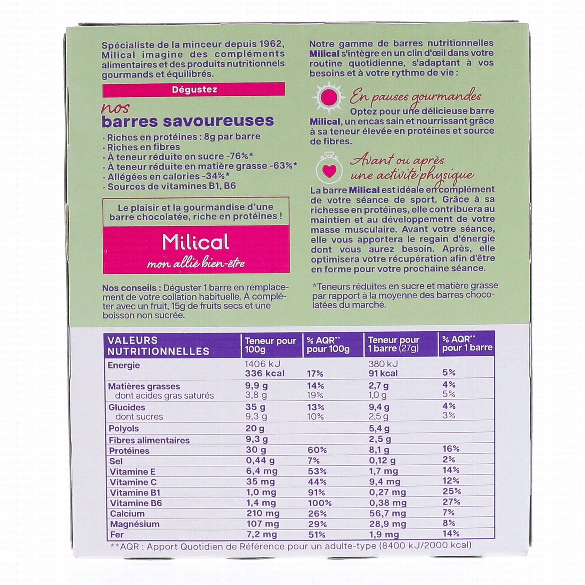 MILICAL Barres minceur hyperprotéinées goût choco pistache x 6 contient les éléments suivants :