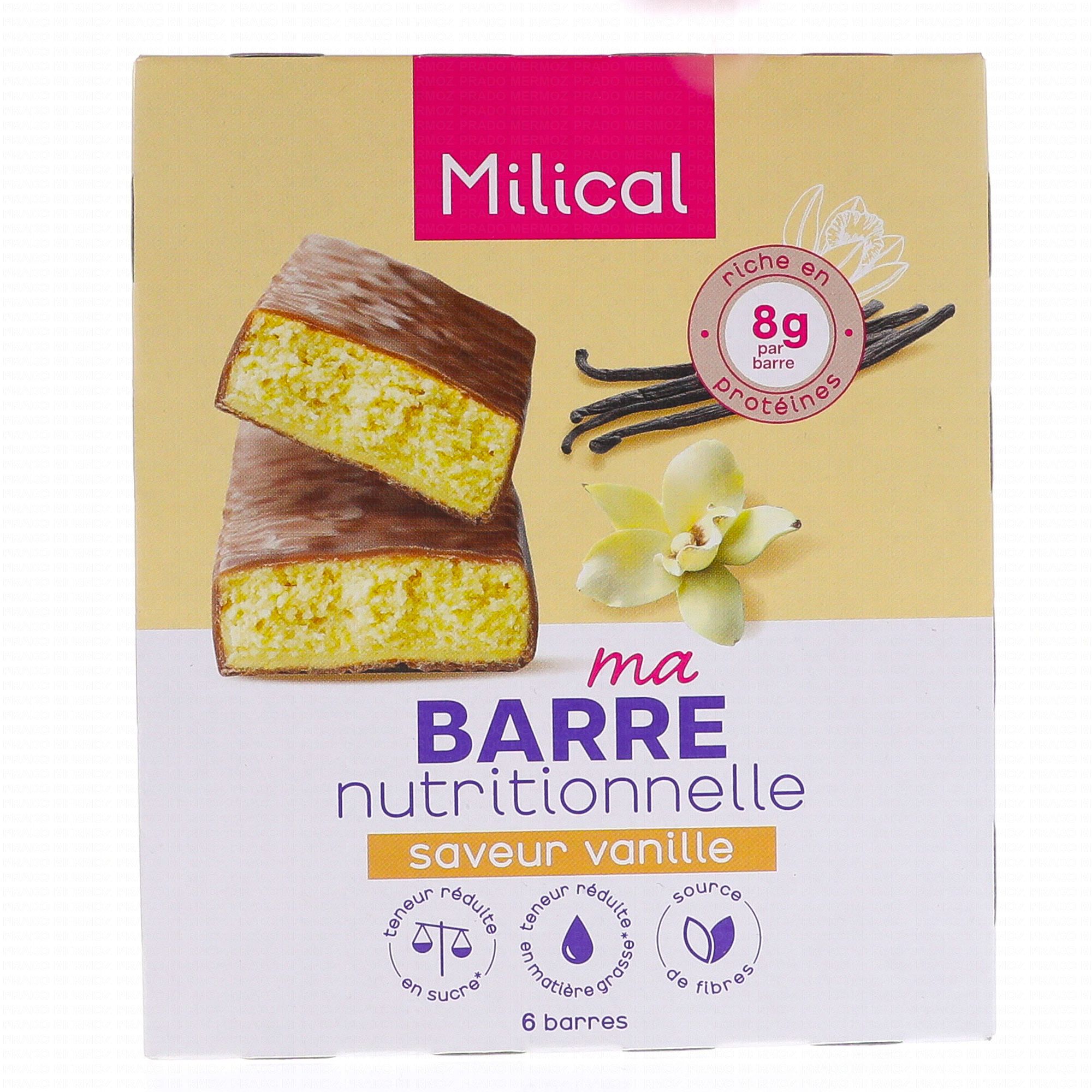 MILICAL Barre hypocalorique saveur vanille boites de 6 barres est un encas hypocalorique, riche en protéines, appauvri en glucides et en lipides, riche en calcium, magnésium, fer et en vitamines B1, B6, C et E.