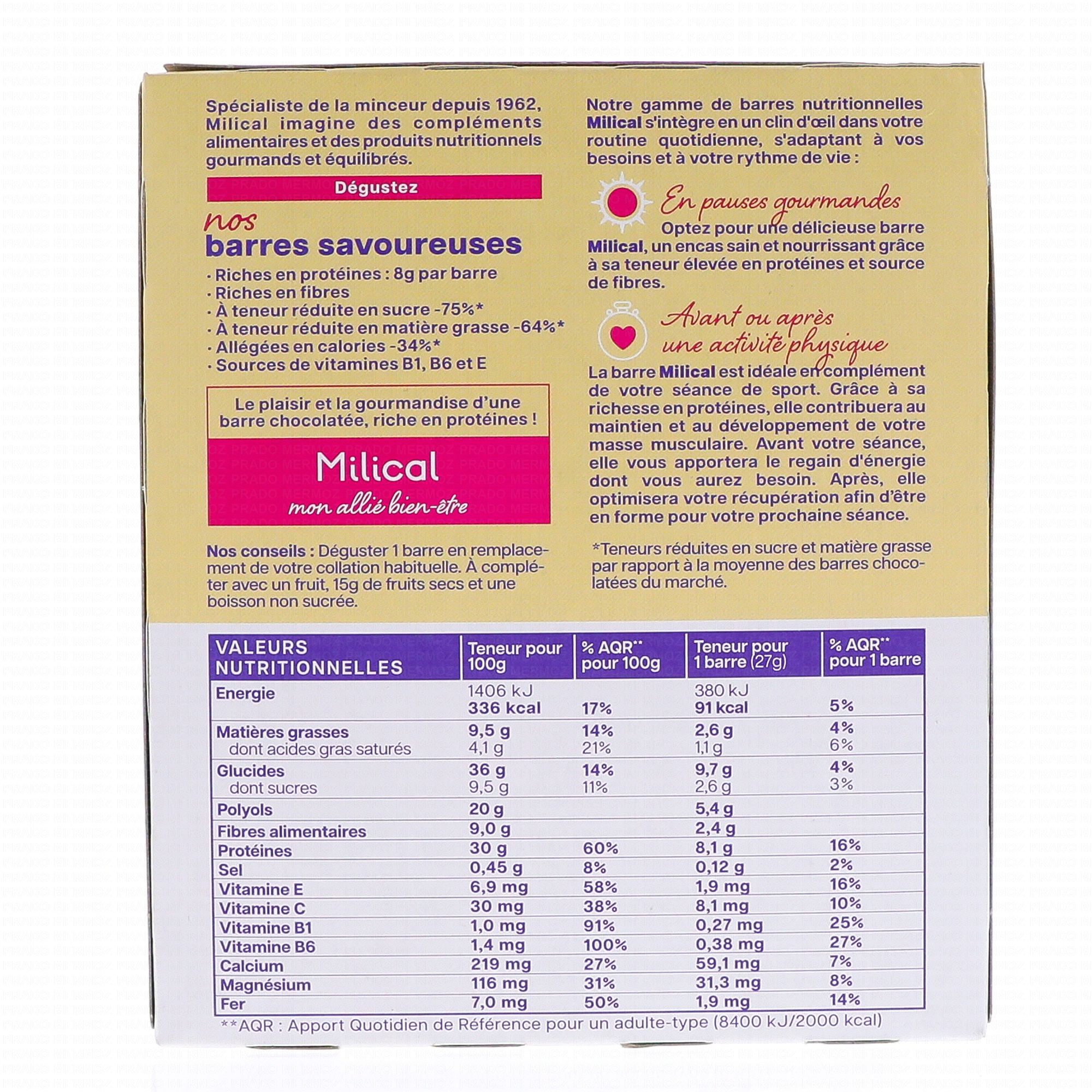 MILICAL Barre hypocalorique saveur vanille boites de 6 barres contient les éléments suivants :
