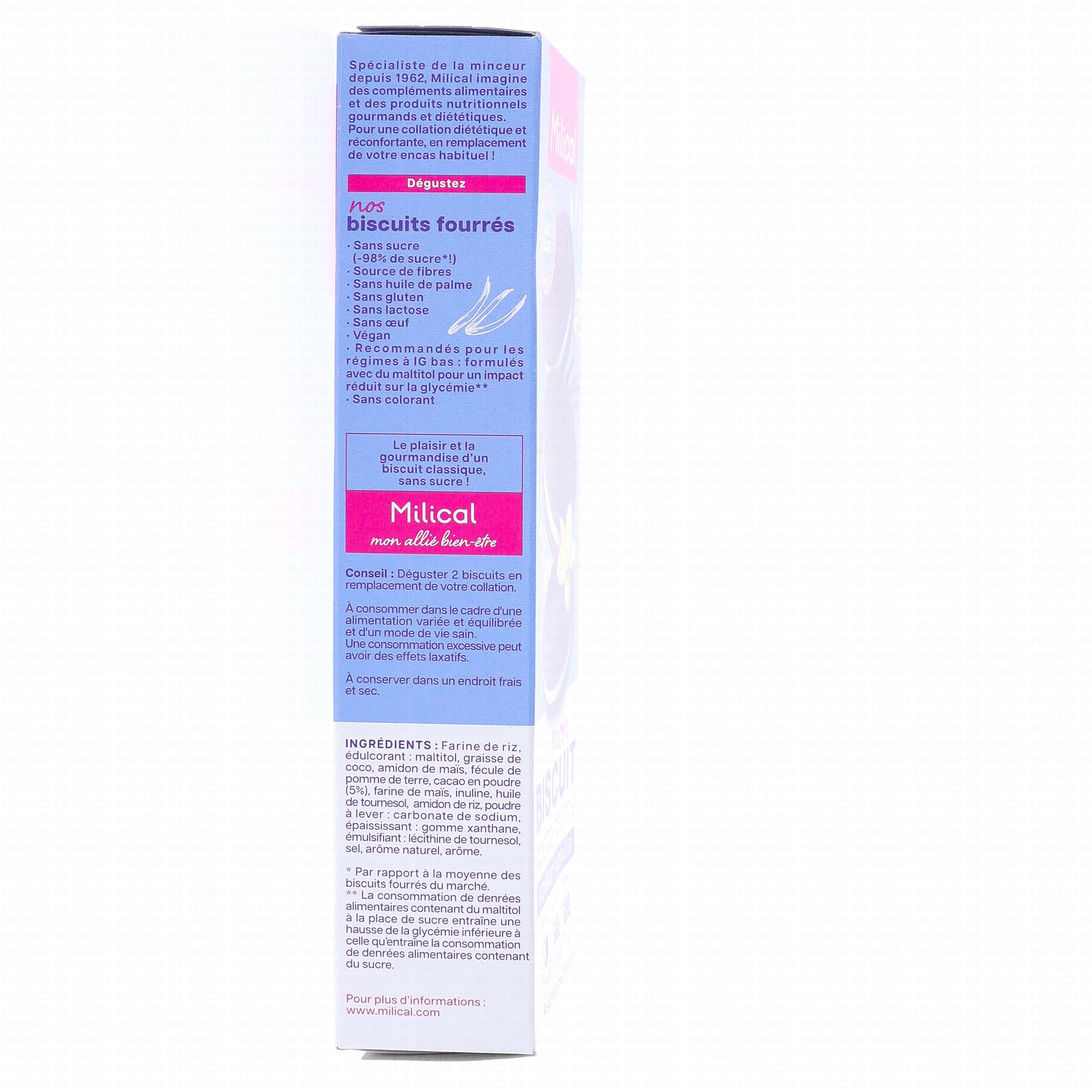 MILICAL Mon Biscuit Cacao Fourré Saveur Vanille 4 sachets de 2 sont sans sucre, sans huile de palme et sans gluten. et source de fibres