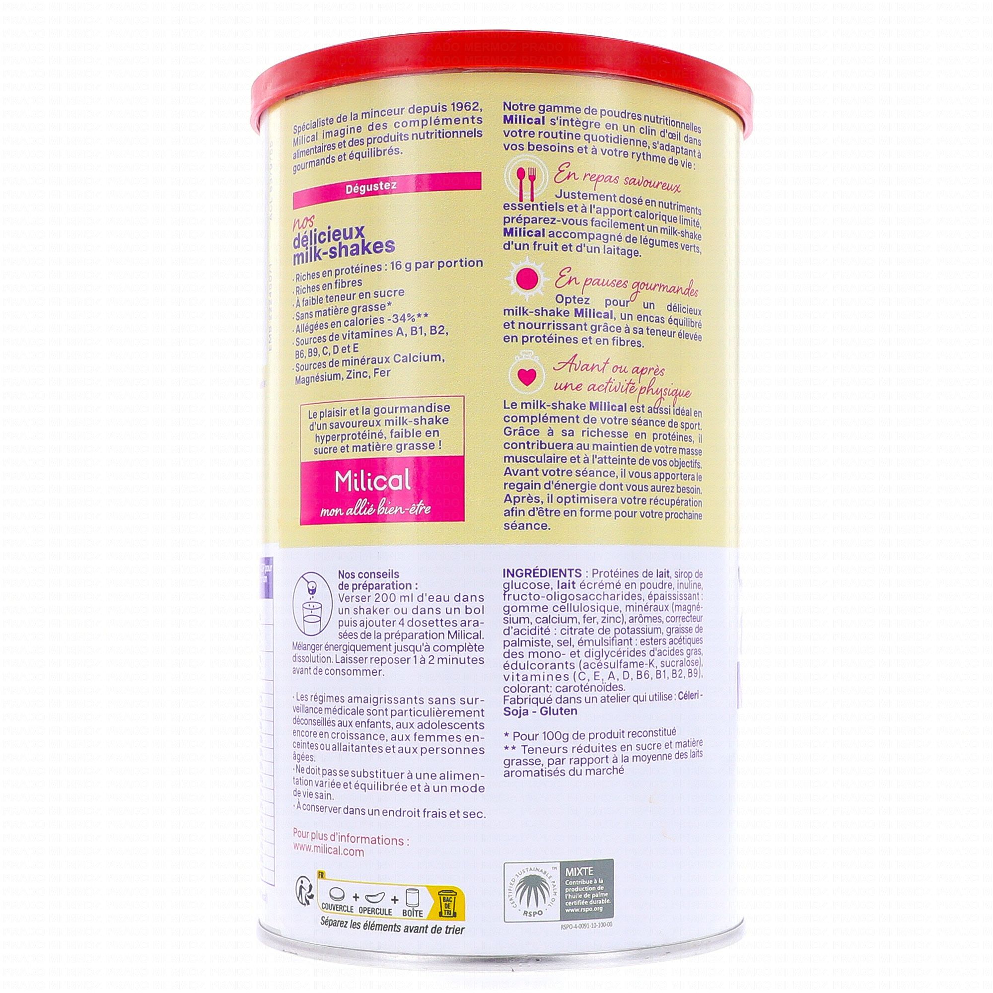 MILICAL Nutrition Milk-shakes saveur vanille 420g est un cas hypocalorique (97 Kcal), riche en protéines (16g par portion), source de vitamines et minéraux, avec édulcorants, à reconstituer pour réaliser un Milk-shake, saveur Vanille.