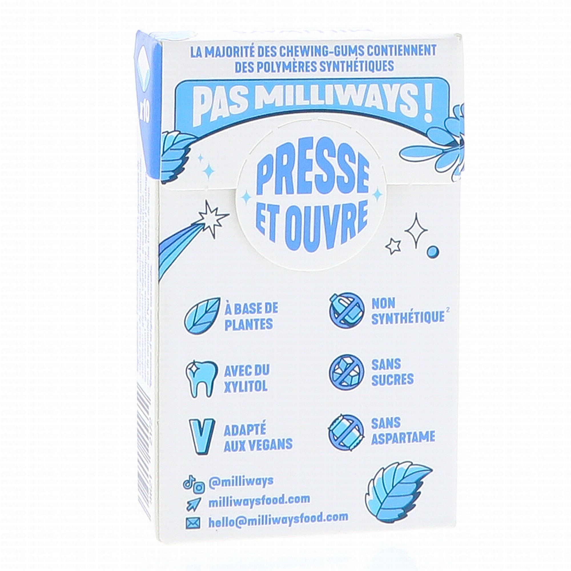 Les Miliways sont des chewing gum naturels sans polymères synthétiques. A base de plantes, ils sont sans sucres, sans aspartame et adaptés aux végans, avec des édulcorants et des arômes naturels.