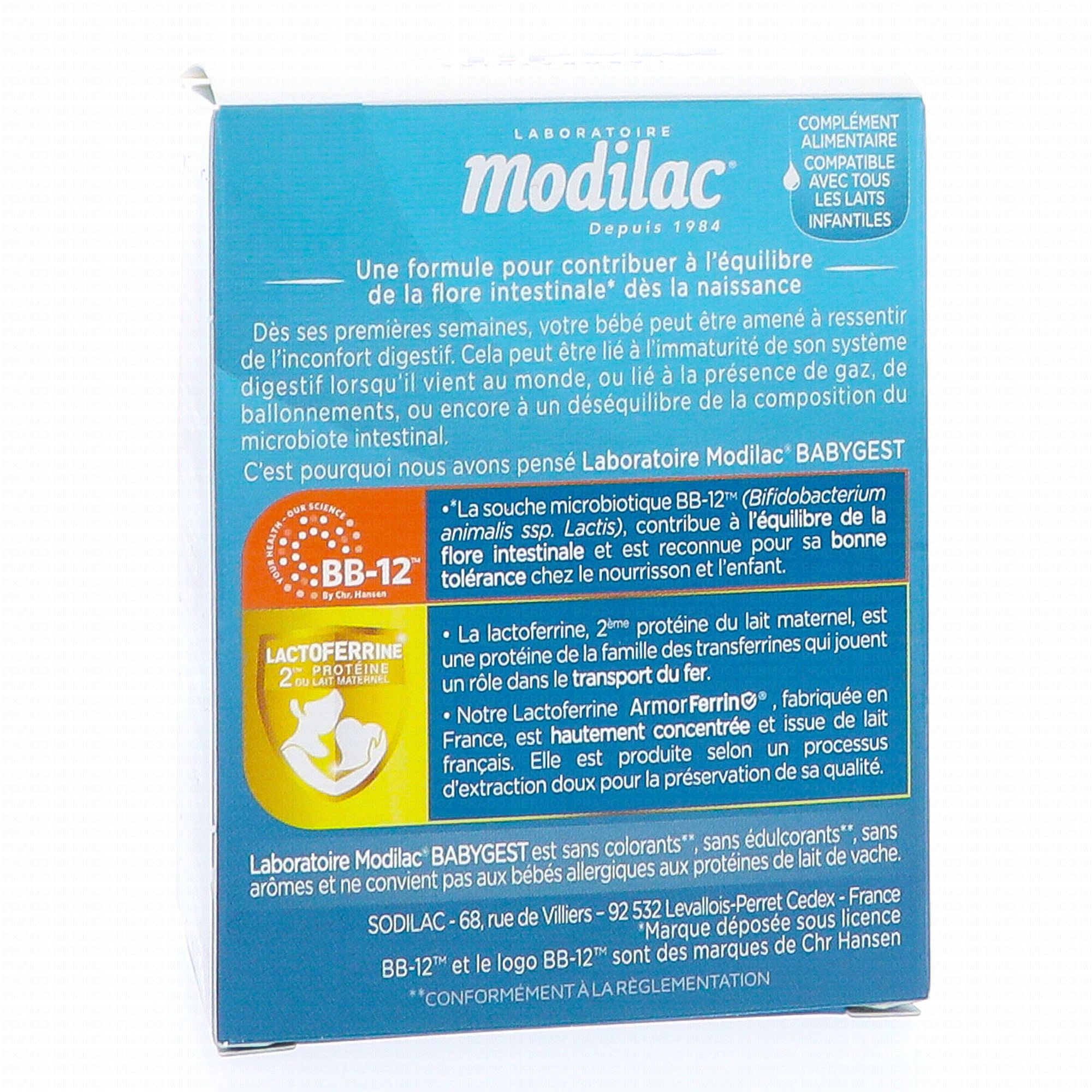 MODILAC Babygest x20 sticks est un complément alimentaire qui contribue à une bonne santé intestinale grâce à la présence de la souche Bifidobacterium animalis.