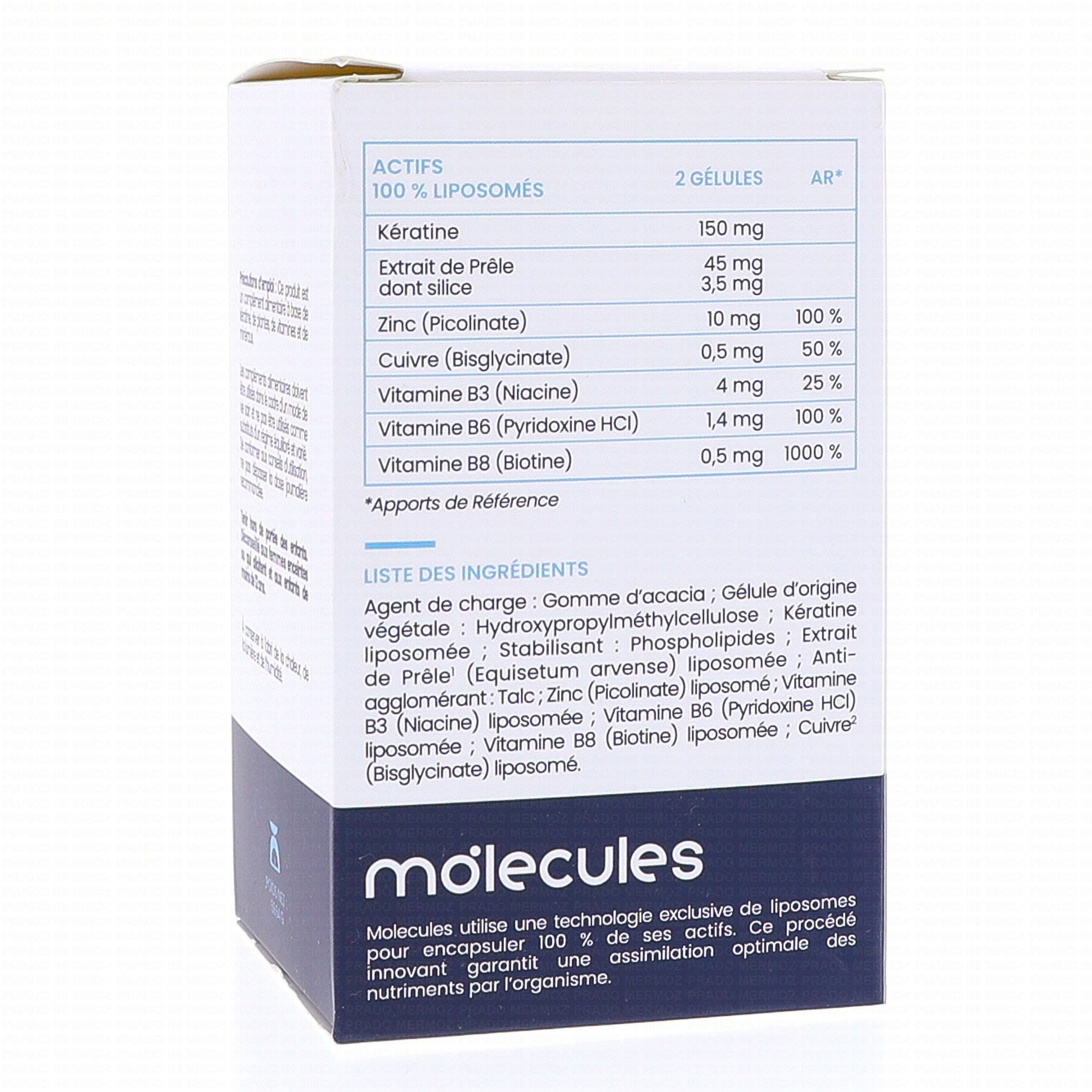 MOLECULES Capillaire 105 gélules est un complément alimentaire qui contribue au bon fonctionnement des phanères grâce à la silice présente dans la prêle. La Biotine aide au maintien de cheveux normaux. Le Cuivre aide au maintien de la pigmentation normale du cheveux.