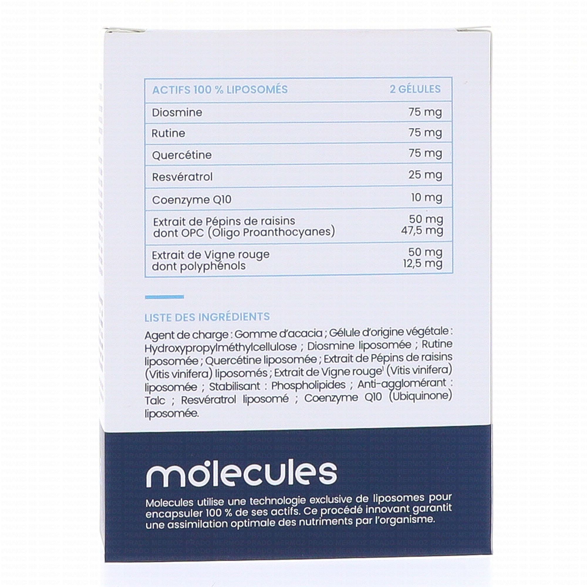 MOLECULES Circulation 30 gélules est un complément alimentaire qui participe à l'intégrité du système veineux grâce à la présence de Vigne Rouge. Le Coenzyme Q10 contribue à la protection des cellules contre le stress oxydatif. La Rutine favorise le fonctionnement des vaisseaux sanguins.