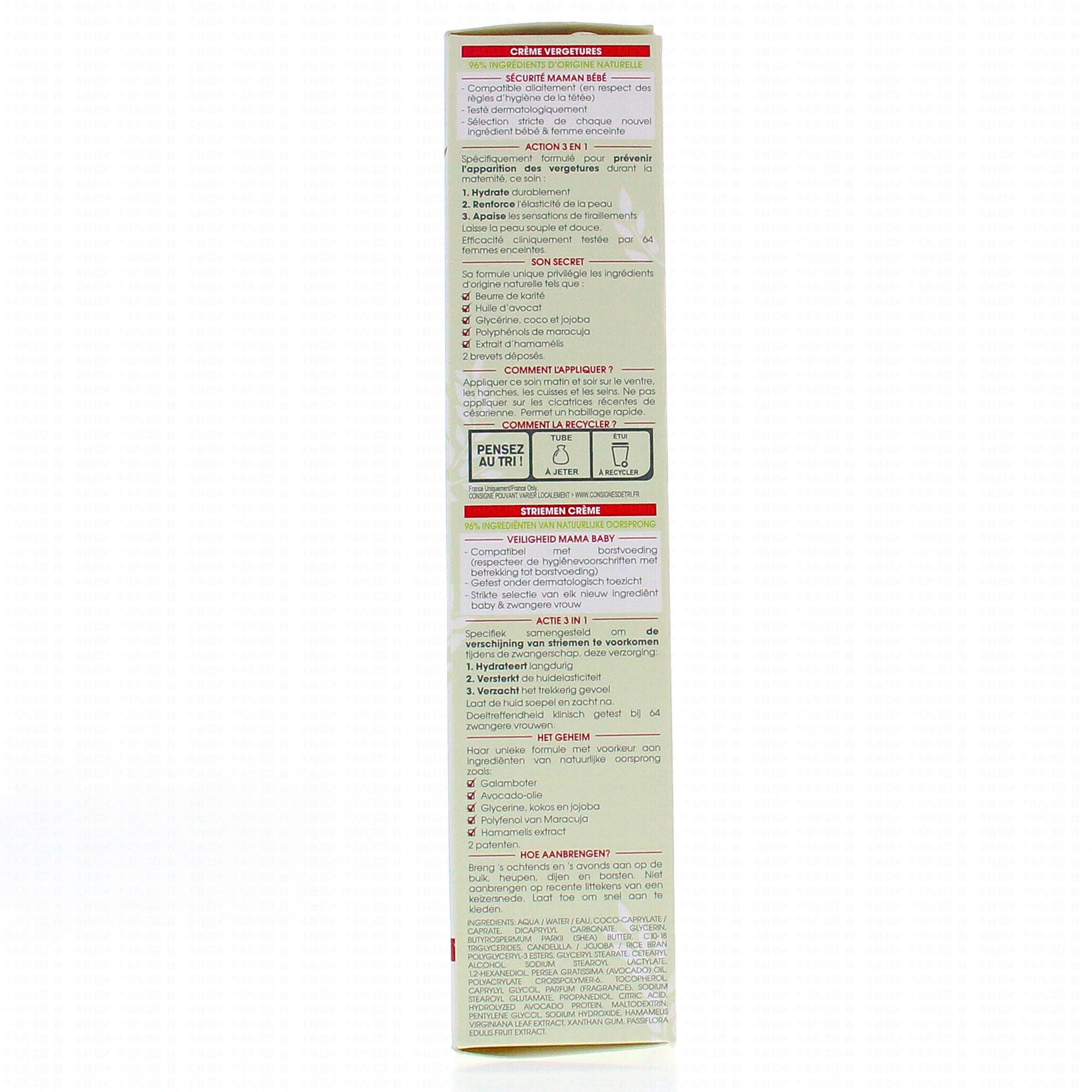 Cette crème vergetures 3 en 1 est spécifiquement formulée pour prévenir l'apparition des vergetures durant la maternité : beurre de karité, huile d'avocat, glycérine, coco et jojoba, polyphénols de maracuja, extrait d'hamamélis.