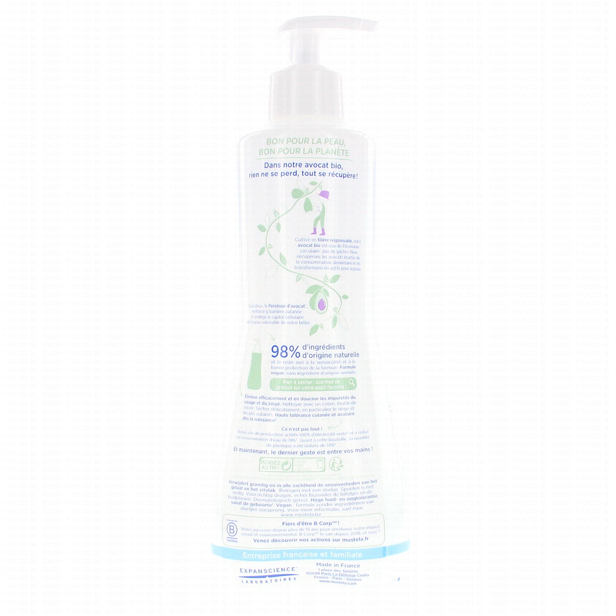 L'eau nettoyante sans rinçage MUSTELA élimine efficacement et en douceur les impuretés du visage et du siège de l'enfant. En effet, formulée à base d'avocat issu de culture BIO et de 98% d'ingrédients d'origine naturelle, cette eau vous permettra de nettoyer en douceur mais aussi d'hydrater la peau de votre enfant, et ce depuis la naissance. Sa formule vegan (sans ingrédients d'origine animale) et fabriquée en France, est testée dermatologiquement. Les laboratoires MUSTELA ont décidé d'utiliser le Perséose d'avocat, un ingrédient qui renforce la barrière cutanée et protège le capital cellulaire de la peau de votre bébé.