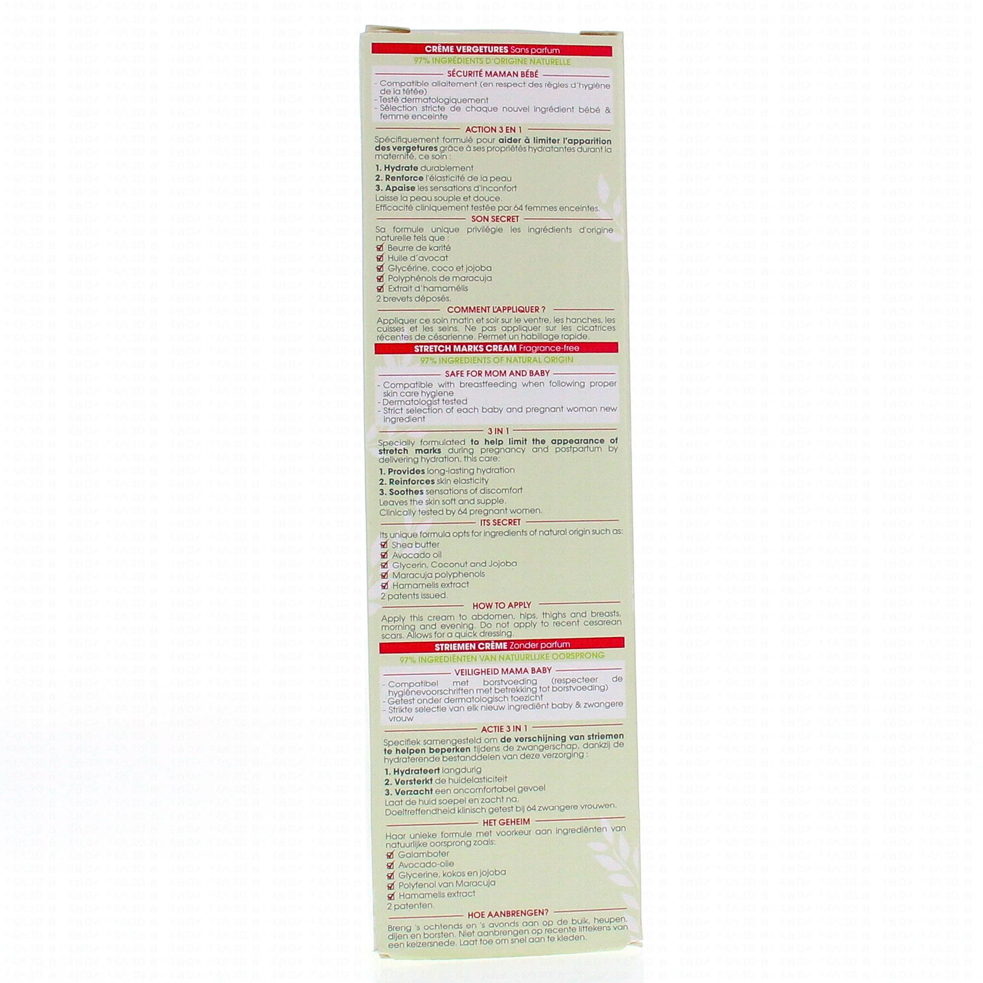 La Crème Vergetures est formulée spécifiquement afin d'aider à limiter l'apparition des vergetures durant la grossesse.