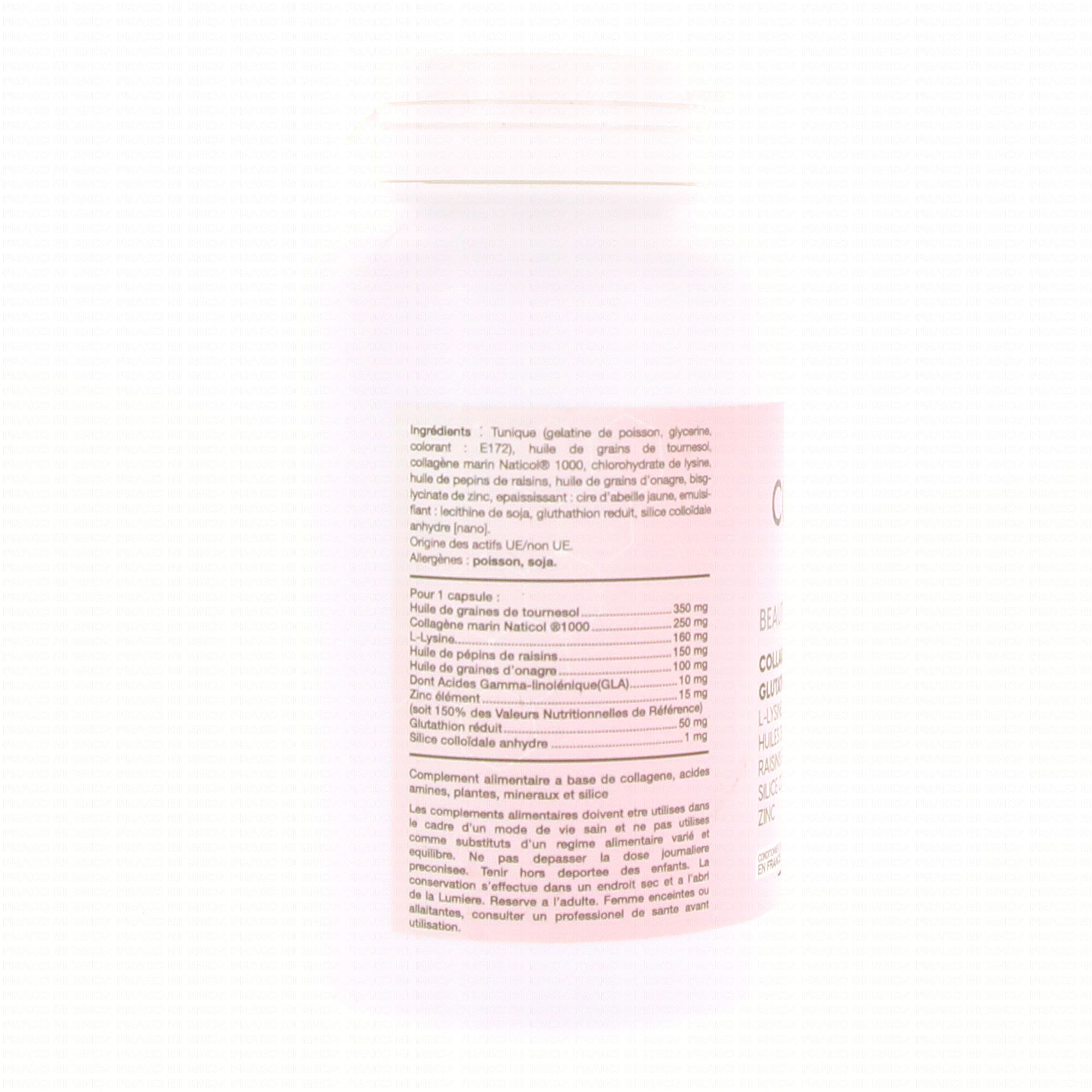 Tunique (gélatine de poisson, glycérine, colorant : E172), huile de graines de tournseol, collagène marin Naticol® 1000, chlorhydrate de lysine, huile de pépins de raisins, huile de graines d'onagre, bisglycinate de zinc, épaississant : cire d'abeille jaune, émulsifiant : lécithine de soja, glutathion réduit, silice colloïdale anhydre.