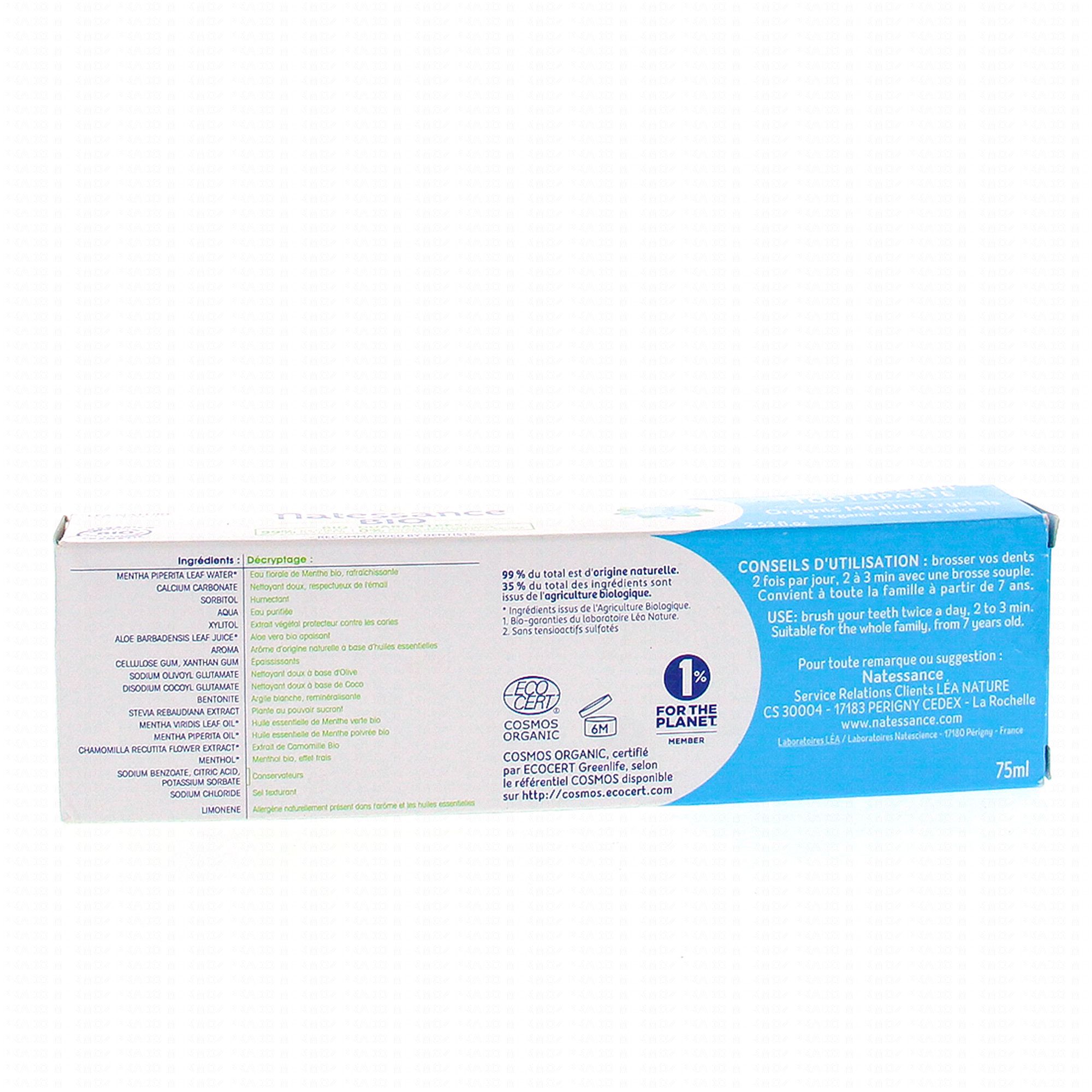 Le dentifrice haleine fraîche Bio Natessance associe les propriétés apaisantes de l'Aloe Vera Bio aux propriétés rafraîchissantes des cristaux de Menthol Bio. En l'utilisant après chaque repas, ce dentifrice élimine efficacement les résidus alimentaires responsables de la formation de la plaque dentaire. Il agit également contre le tartre et vous offre une protection contre les caries, le tout en préservant l'émail de vos dents et en apaisant vos gencives.