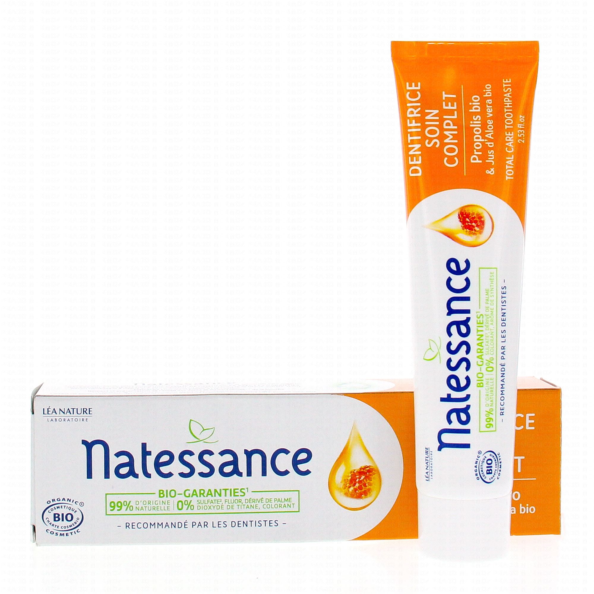 Natessance dentifrice soin complet est formulé pour nettoyer les dents en douceur, prévenir la formation de caries, renforcer l'émail des dents et permettre une haleine fraîche. Il va également respecter l'équilibre du microbiote de la bouche, fondamental pour l'hygiène bucco-dentaire.