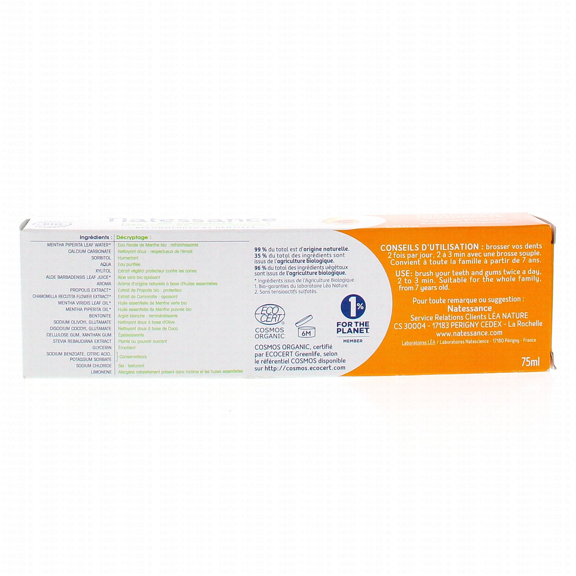 Testé sous contrôle odontologique. Sans sulfate, fluor, dérivé de palme, dioxyde de titane ni colorant. 99% du total est d'origine naturelle. 35% du total des ingrédients sont issus de l'Agriculture Biologique. 96% du total des ingrédients végétaux sont issus de l'Agriculture Biologique. Sans fluor, sans sulfate et sans dioxyde de titane