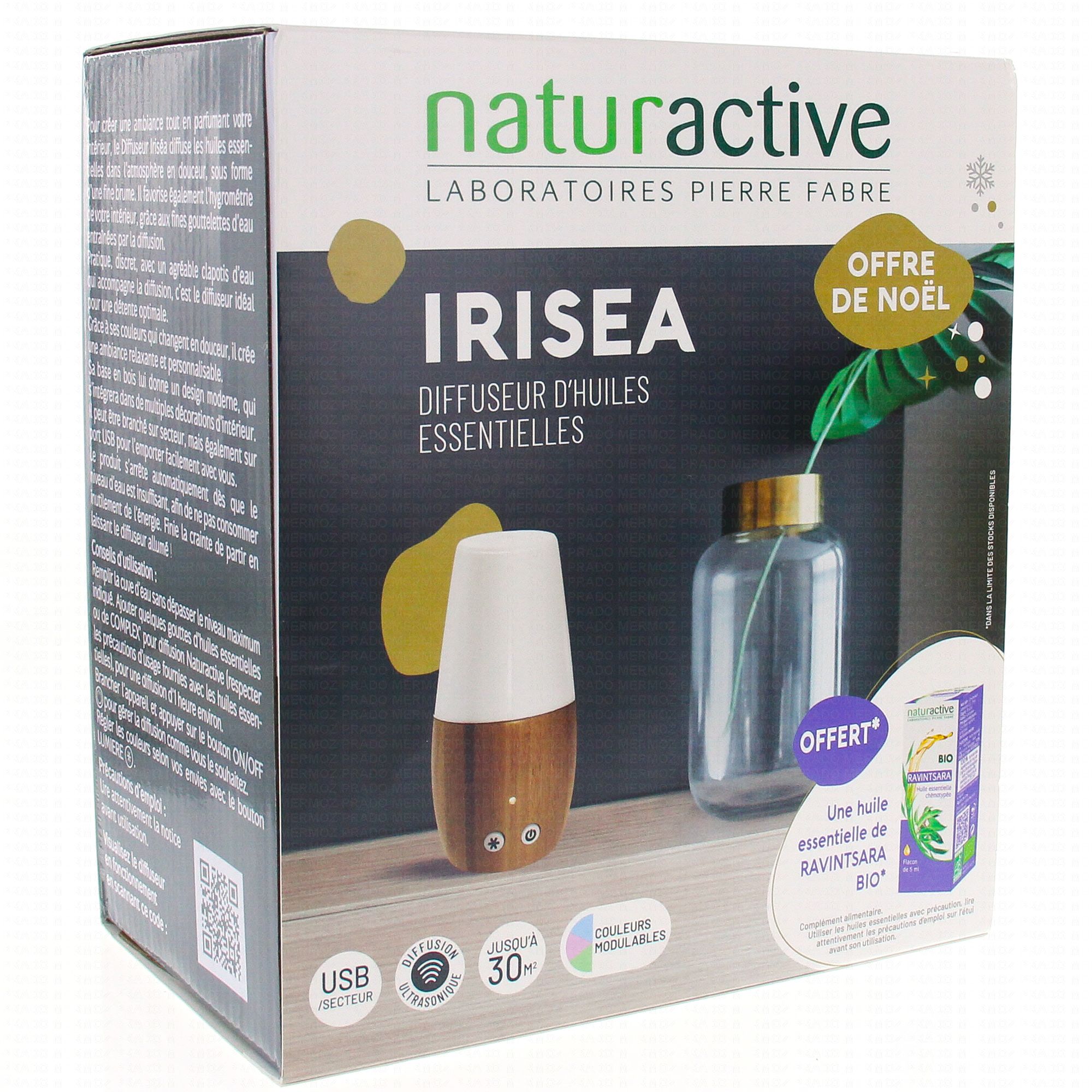 Naturactive diffuseur d'huiles essentielles IRISEA est compose d'1 nébuliseur en plastique, d'1 socle en bois, d'1 adaptateur électrique, d'1 notice d'utilisation plus 1 huile essentielle de mandarinier bio offerte.