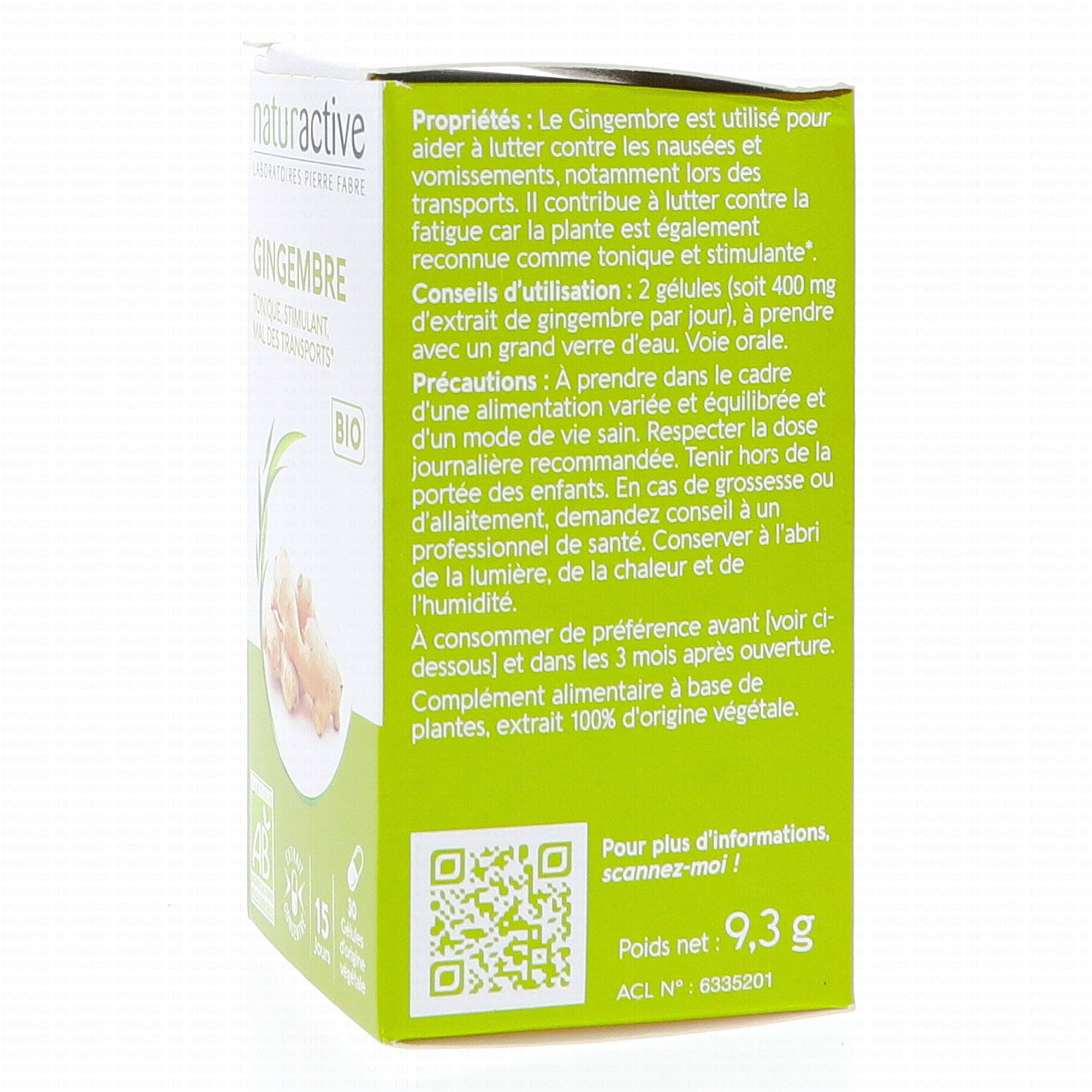 Pour une gélule : Gingembre (extrait sec de rhizomes de Zingiber officinale Roscoe sur maltodextrine) : 200 mg, Gélatine, Lactose, Antiagglomérants : stéarate de magnésium, dioxyde de silicium (nano), Colorant : dioxyde de titane.
