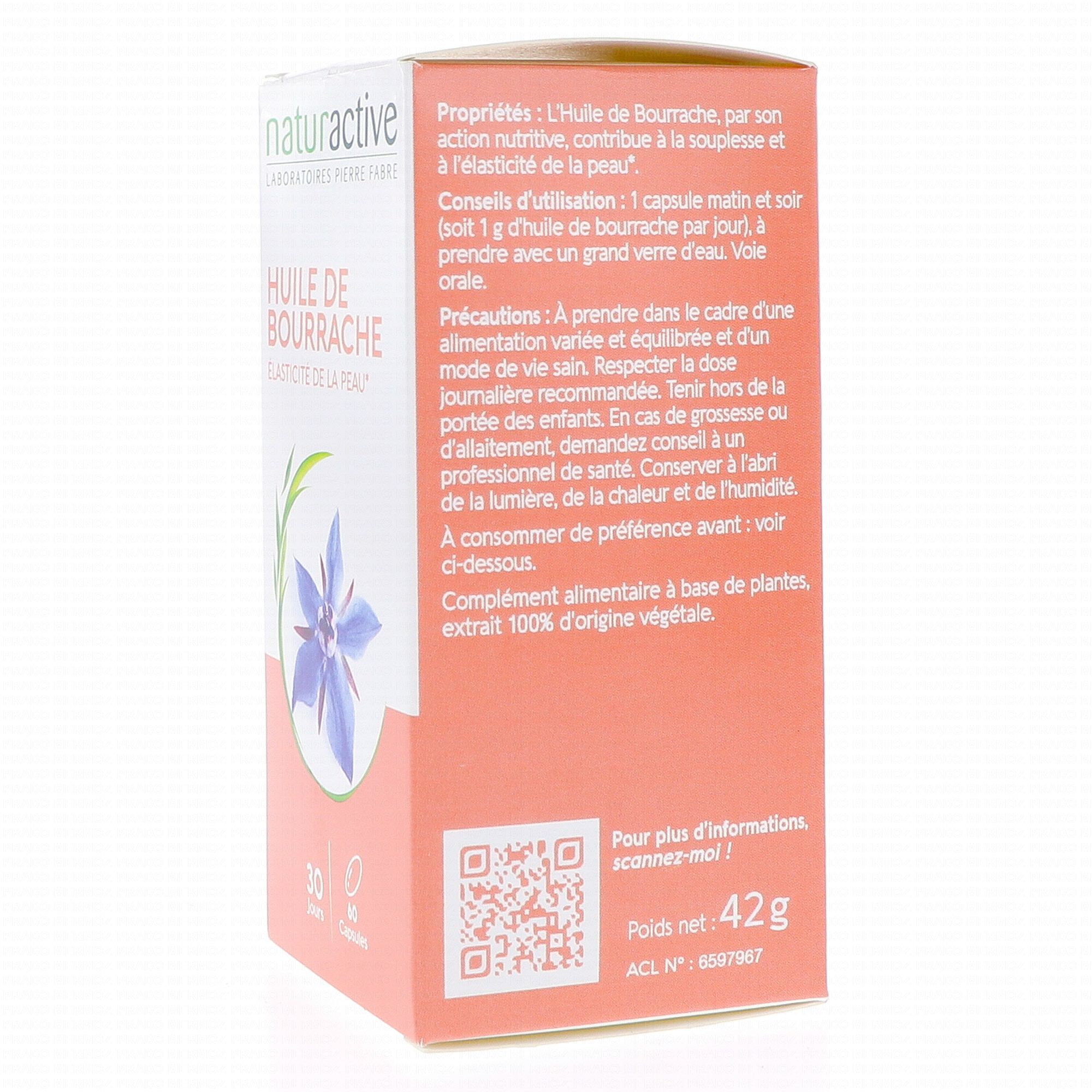 NATURACTIVE huile de bourrache est un complément alimentaire à bas d'extrait d'huile de bourrache reconnue pour son action nutritive au niveau de la peau et des muqueuses, ce qui contribue à leurs redonner souplesse et l'élasticité.