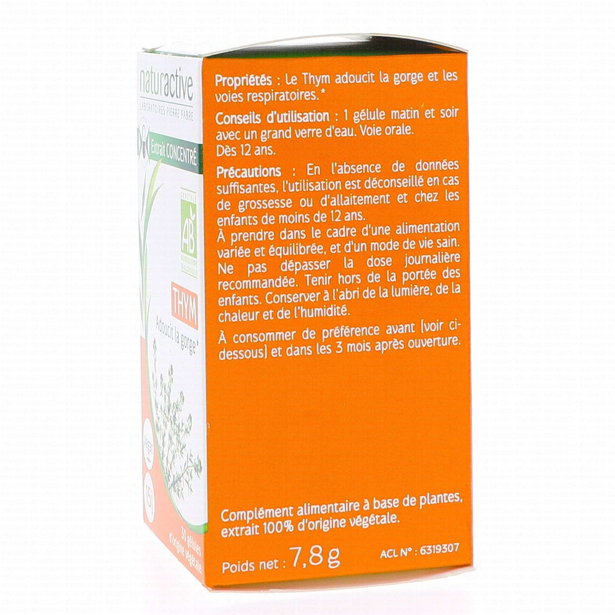 Pour une gélule : thym (extrait sec de thymus Vulgaris L. sur maltodextrine et gomme arabique) : 200 mg ; gélatine ; antiagglomérants : talc, dioxyde de silicium (nano), huile végétale hydrogénée ; Colorant : dioxyde de titane.