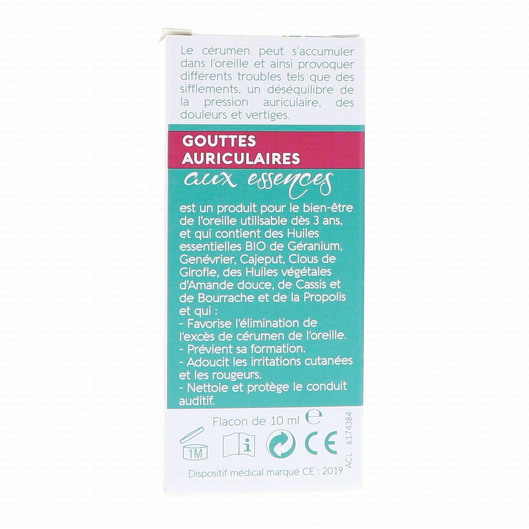 Naturactive Gouttes Auriculaires Aux Essences est un produit pour le bien-être de l'oreille utilisable dès 3 ans. Il est à base d'huiles essentielles Bio (Géranium, Genévrier, Cajeput, Clous de Girofle) et d'huiles végétales (Amande douce, Cassis, Bourrache, Propolis). Il favorise ainsi l'élimination de l'excès de cérumen de l'oreille, il prévient sa formation, il adoucit les irritations cutanées et les rougeurs, il nettoie et protège le conduit auditif.