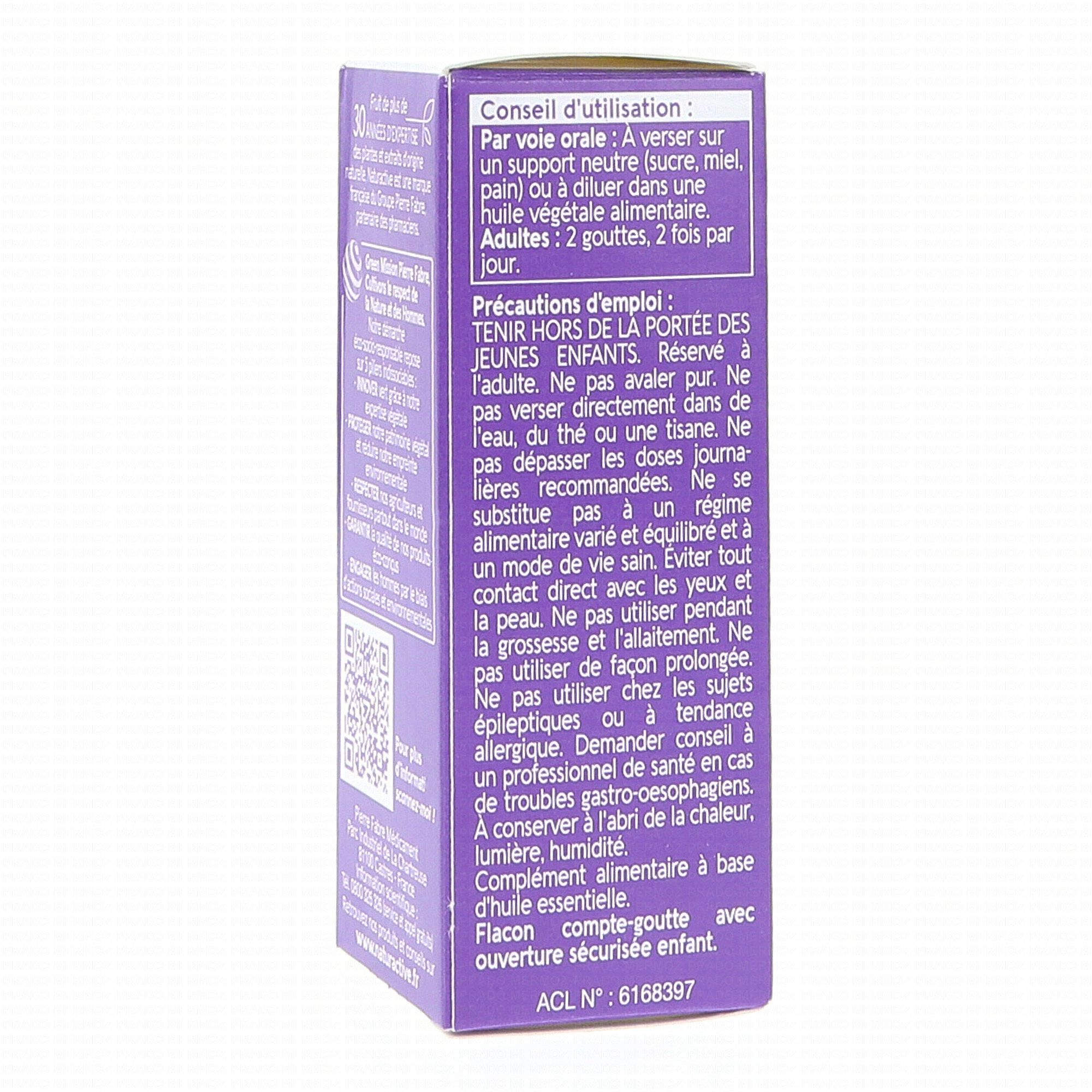 Avant toute utilisation veuillez consulter l'onglet PRECAUTIONSVoie orale réservée à l'adulte et en association avec une huile essentielle de citronnier.