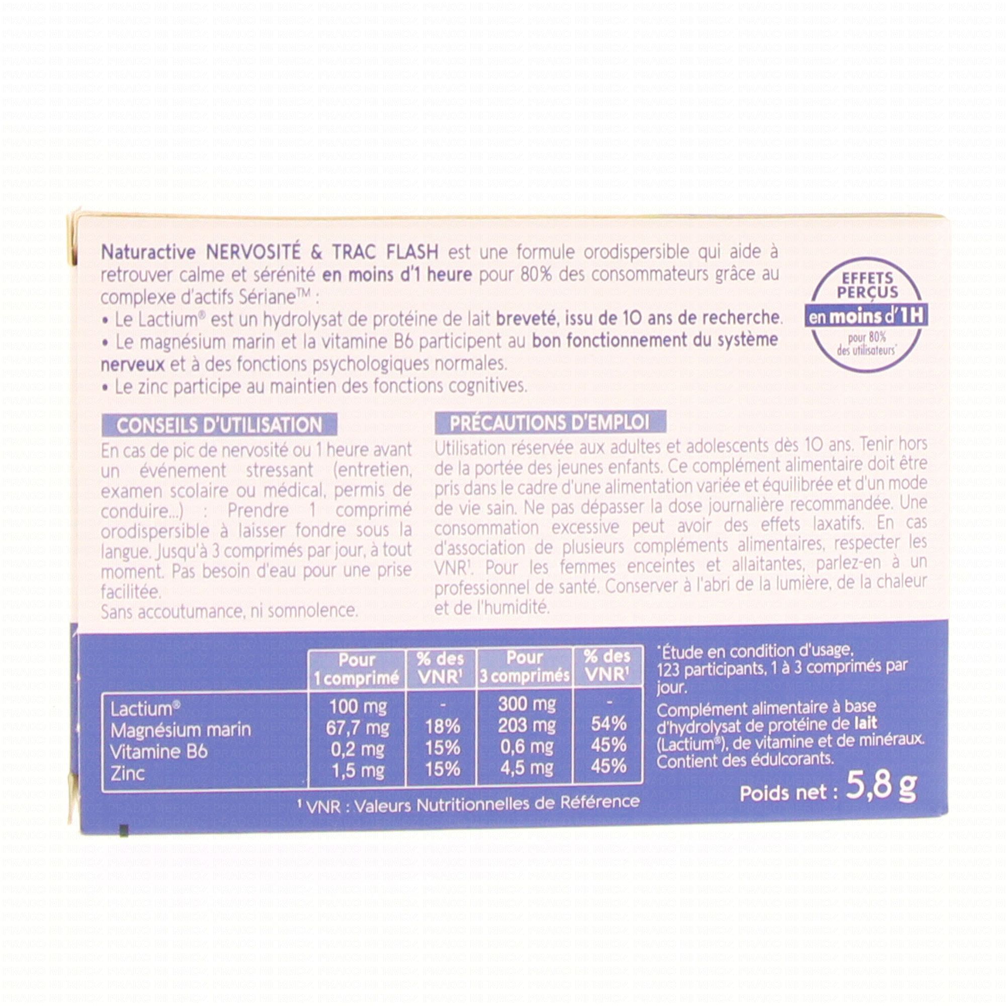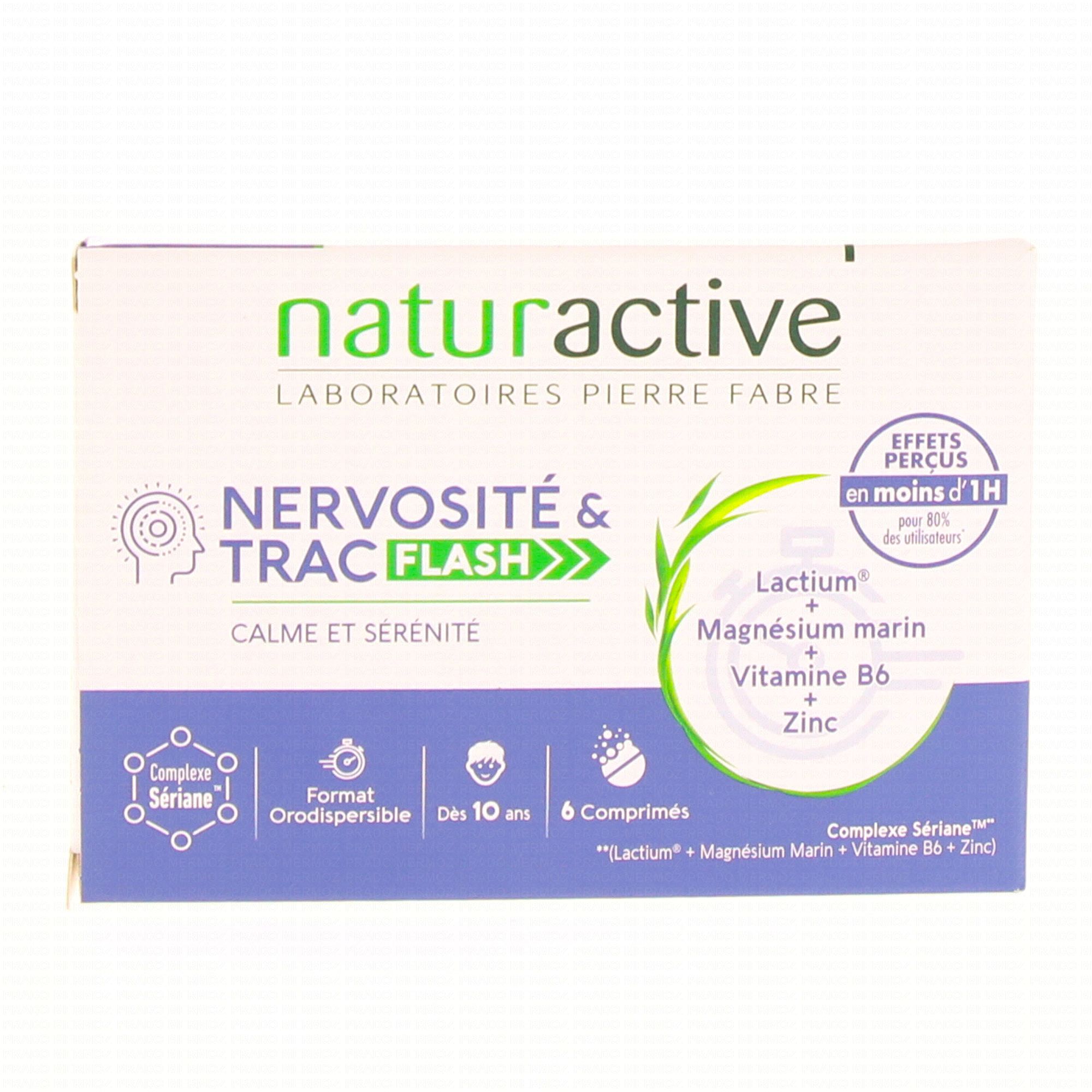 NATURACTIVE Nervosité & Trac Flash 6 comprimés est un complément alimentaire qui contribue au fonctionnement normal du système nerveux grâce à la présence de Magnésium et de vitamine B6. Le Zinc aide au maintien d'une fonction cognitive normale.