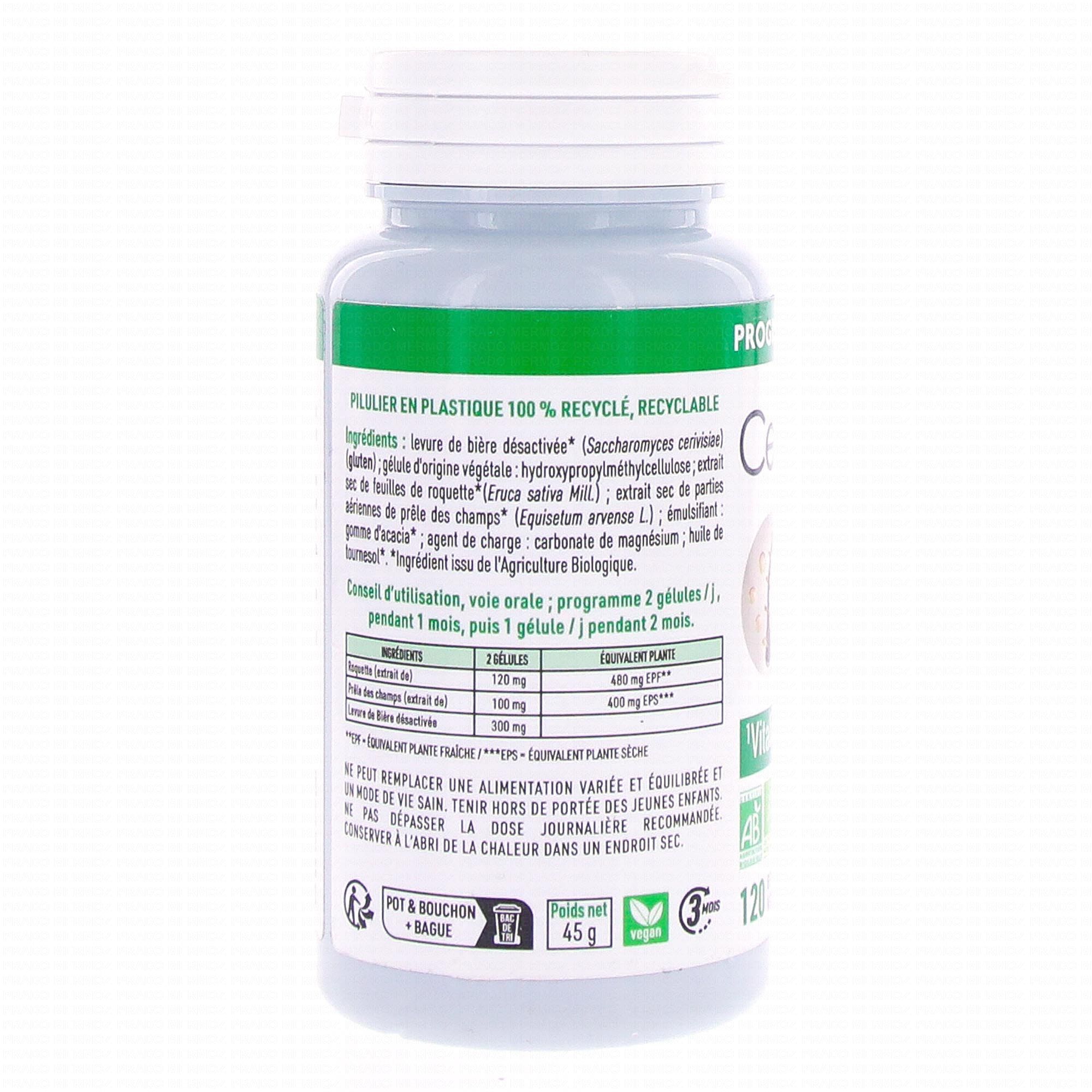 Levure de bière désactivée* (Saccharomyces cerevisae) (gluten) ; gélule d'origine végétale : hydroxypropylméthylcellulose ; extrait sec de feuilles de roquette* (Eruca sativa Mill.) ; extrait sec de parties aériennes de prêle des champs* (Equisetum arvense L.) ; émulsifiant : gomme d'acacia* ; agent de charge : carbonate de magnésium ; huile de tounesol*.