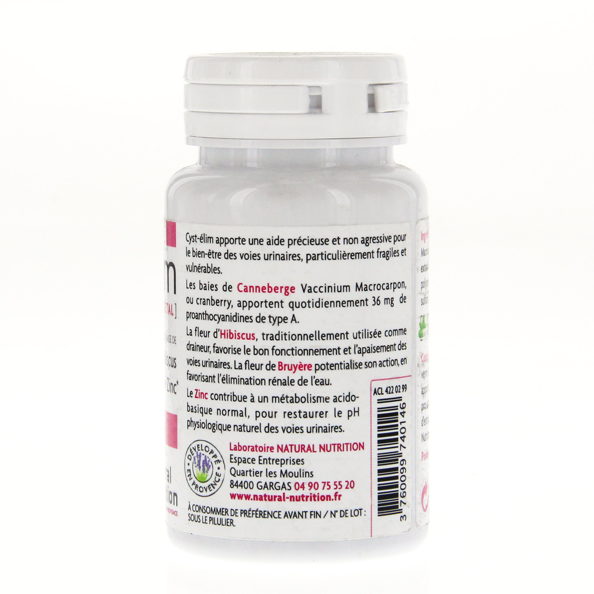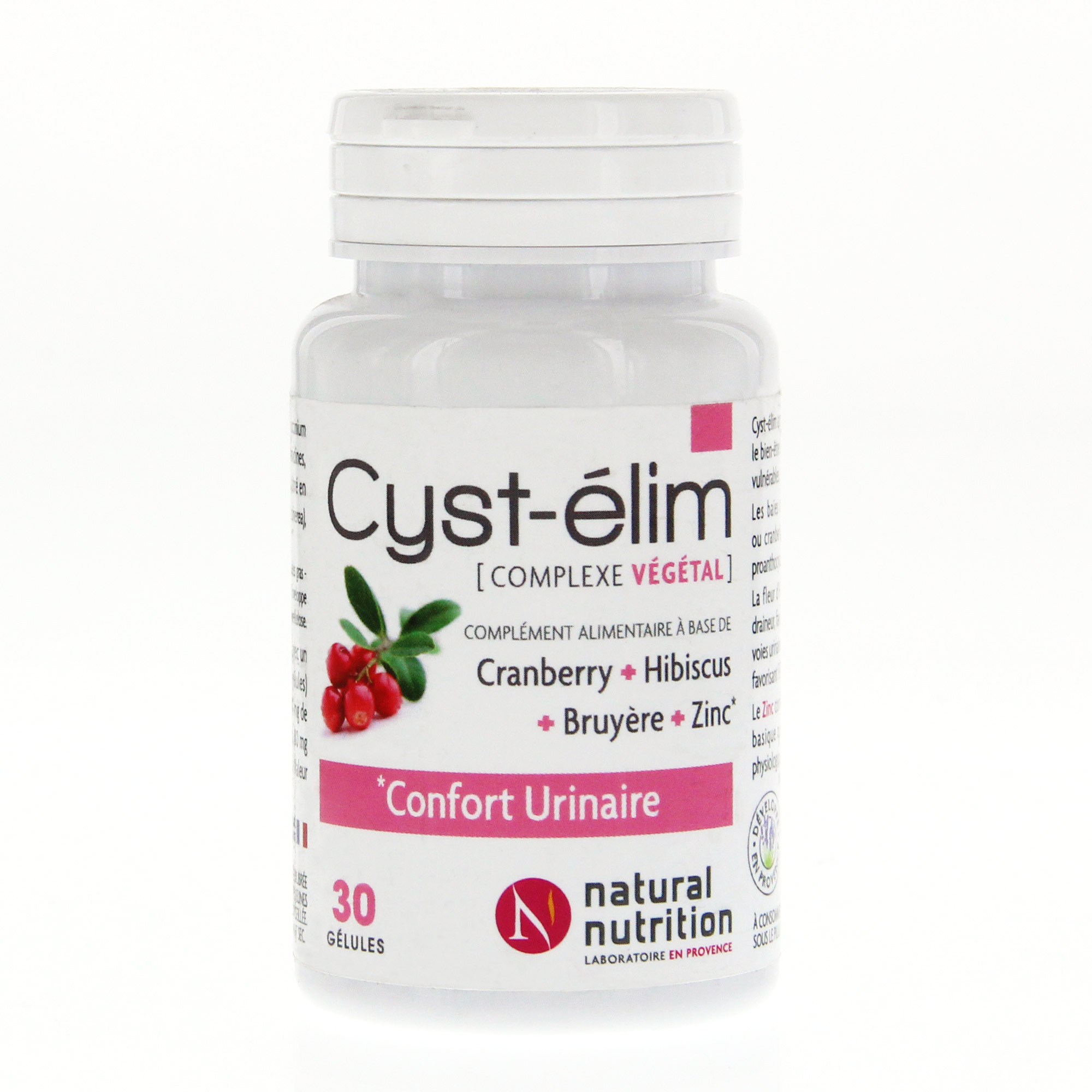 NATURAL NUTRITION Cyst Elim pot de 30 gélules, grâce à la canneberge contribue à inhiber la fixation de certaines bactéries E.Coli dans les voies urinaires.