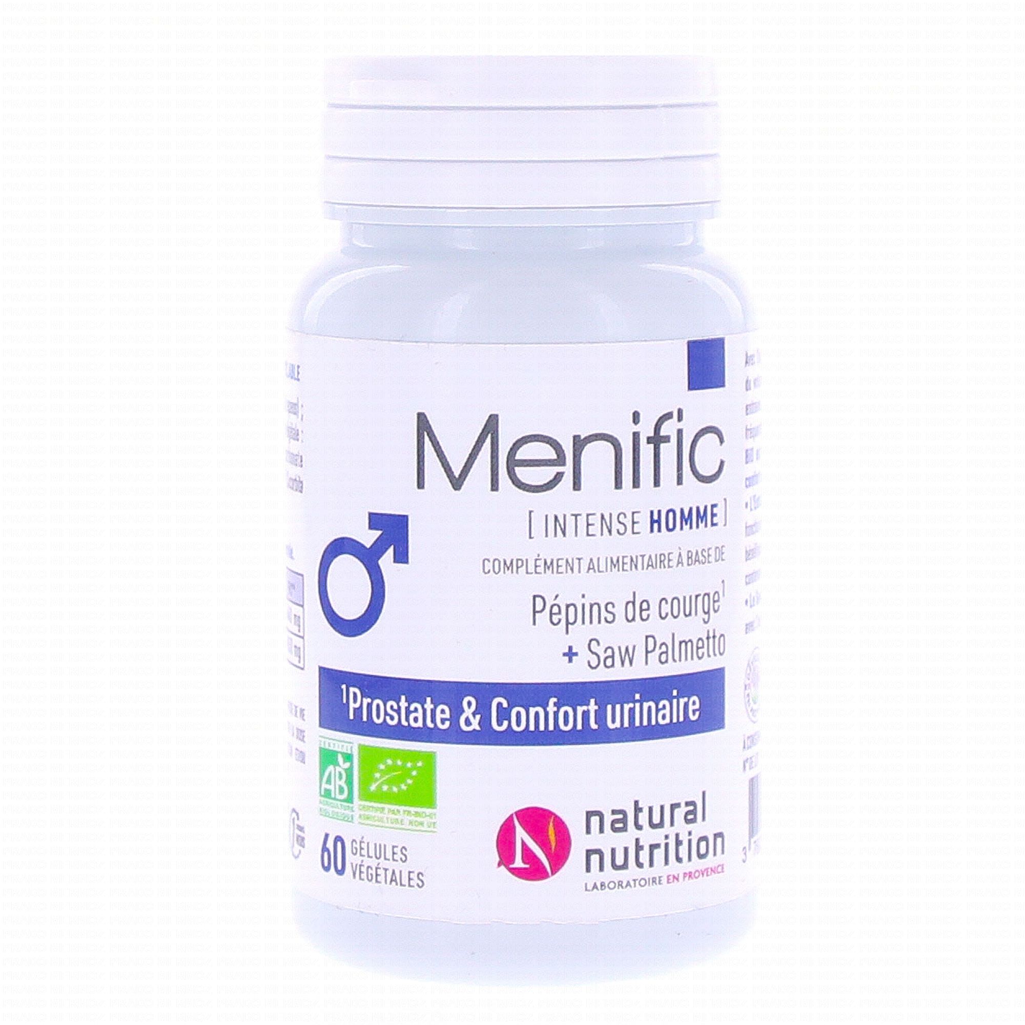 NATURAL NUTRITION Menific intense homme bio x60 gélules est un complément alimentaire qui contribue au fonctionnement normal du système urinaire pour l'homme grâce à la présence de Palmier nain.