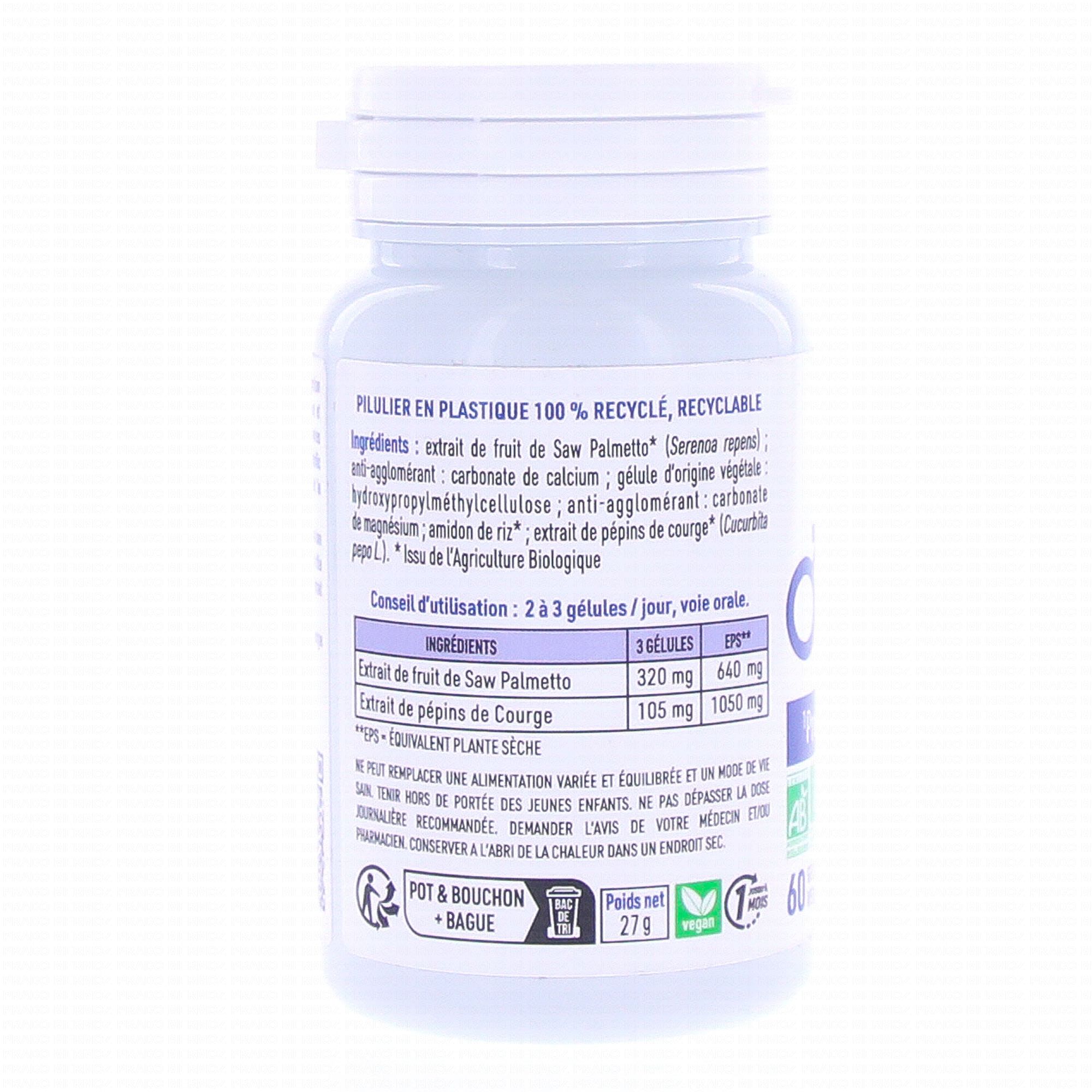 extrait de fruit de Saw Palmetto* (Serenoa repens) ; anti-agglomérant : carbonate de calcium ; gélules d'origine végétale : hydroxypropylméthycellulose ; anti-agglomérant : carbonate de magnésium : amidon de riz* ; extrait de pépins de courge* (Cucurbita pepo L.). *Issu de l'agriculture biologique