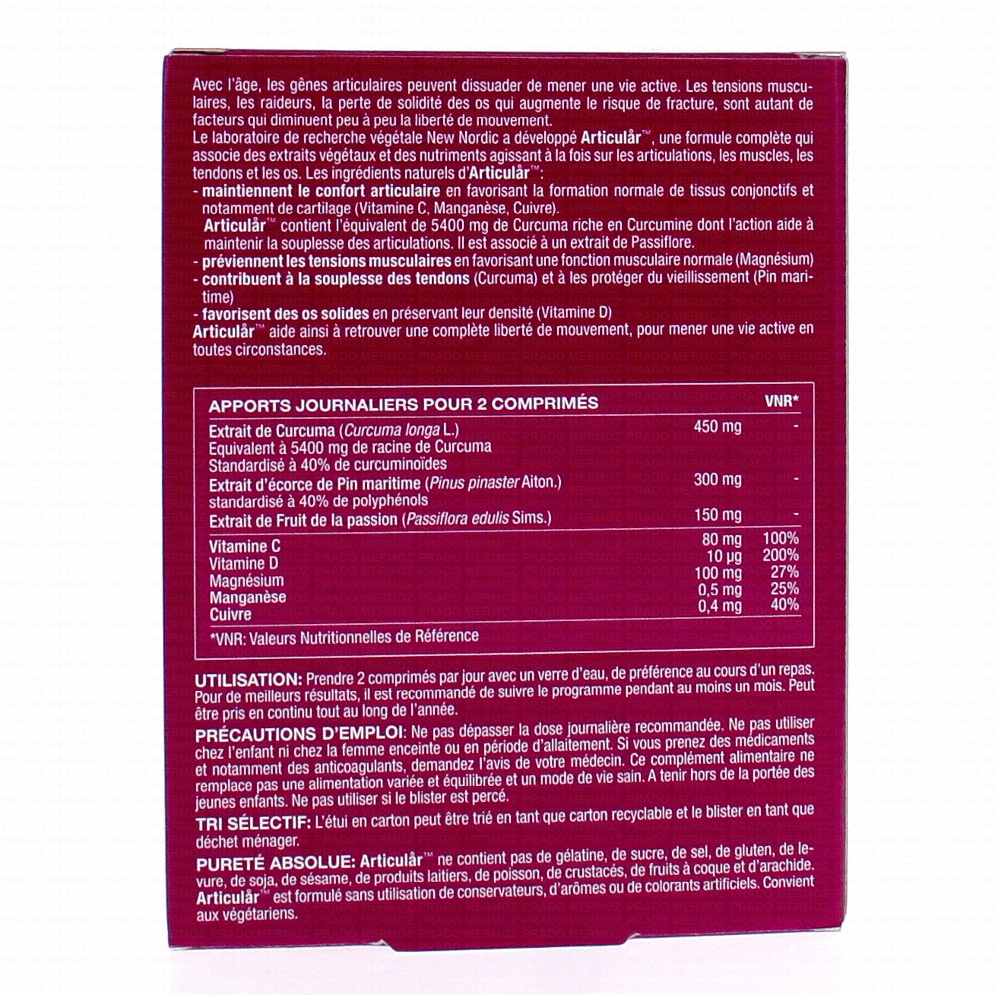 Extrait de curcuma 450 mg ( équivalent à 5400mg de racine de curcuma), standardisé à 40% de curcuminoïdes ; extrait décorce de pin maritime 300 mg standardisé à 40% de ^polyphénols ; extrait de fruit de la passion 150 mg ; extrait de poivre noir 50 mg standardisé à 40% de pipérine, vitamine C 80 mg (100% VNR*) ; vitamine D 10 µg (200% VNR*) ; magnésium 100 mg (27% VNR*) ; manganèse 0.5 mg ( 25% VNR*) ; cuivre 0.4 mg (4%).