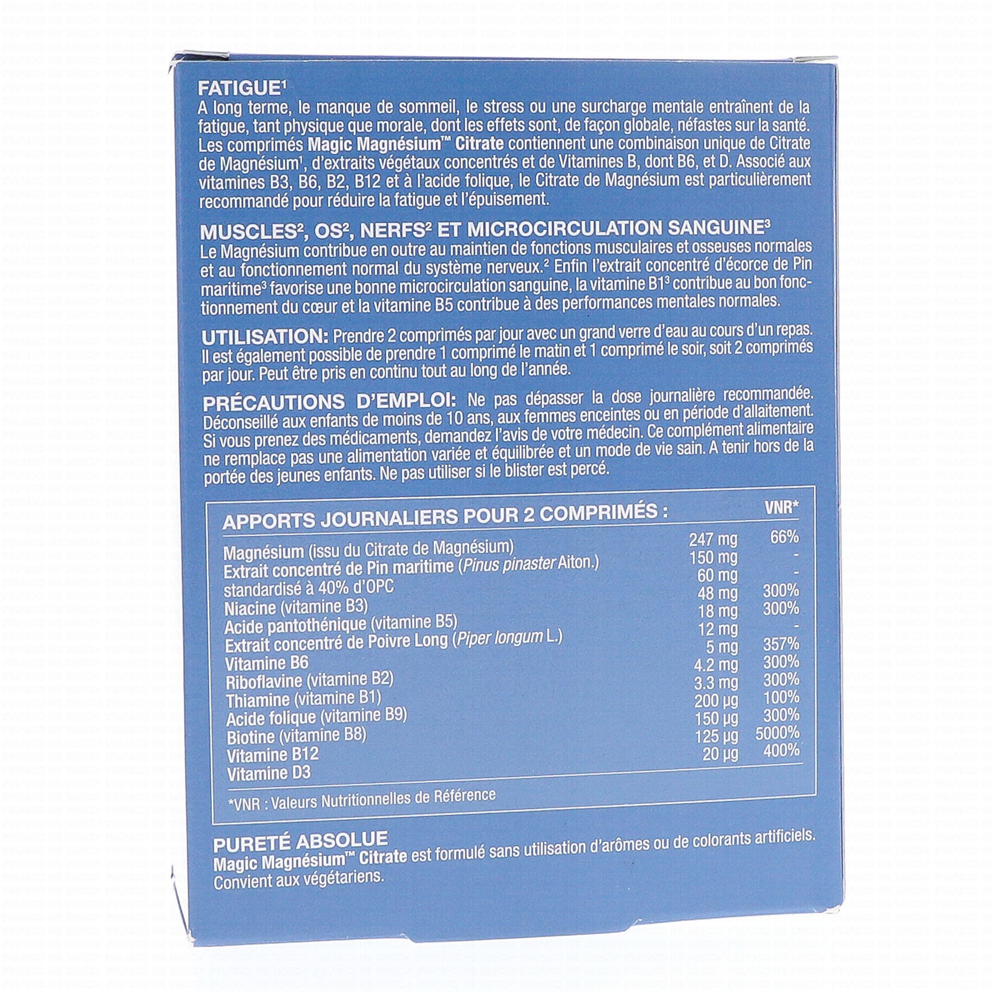 Extrait de Pin Maritime (Pinus pinaster Aiton.) standardisé à 40% d'OPC, Extrait de Poivre Long (Piper longum L.), Magnésium (issu du Citrate de Magnésium), Niacine (Vitamine B3), Acide pantothénique (Vitamine B5), Vitamine B6, Riboflavine (Vitamine B2), Thiamine (Vitamine B1), Acide Folique (Vitamine B9), Biotine (Vitamine B8), Vitamine B12, Vitamine D3.Magic Magnésium Citrate ne contient pas de gélatine, de sucre, de sel, de gluten, de levure, de soja, de sésame, de produits laitiers, de poisson, de crustacés, de fruits à coque et d'arachide. Magic Magnésium Citrate est formulé sans utilisation de conservateurs, d'arômes ou de colorants artificiels. Convient aux végétariens. Non testé sur des animaux.