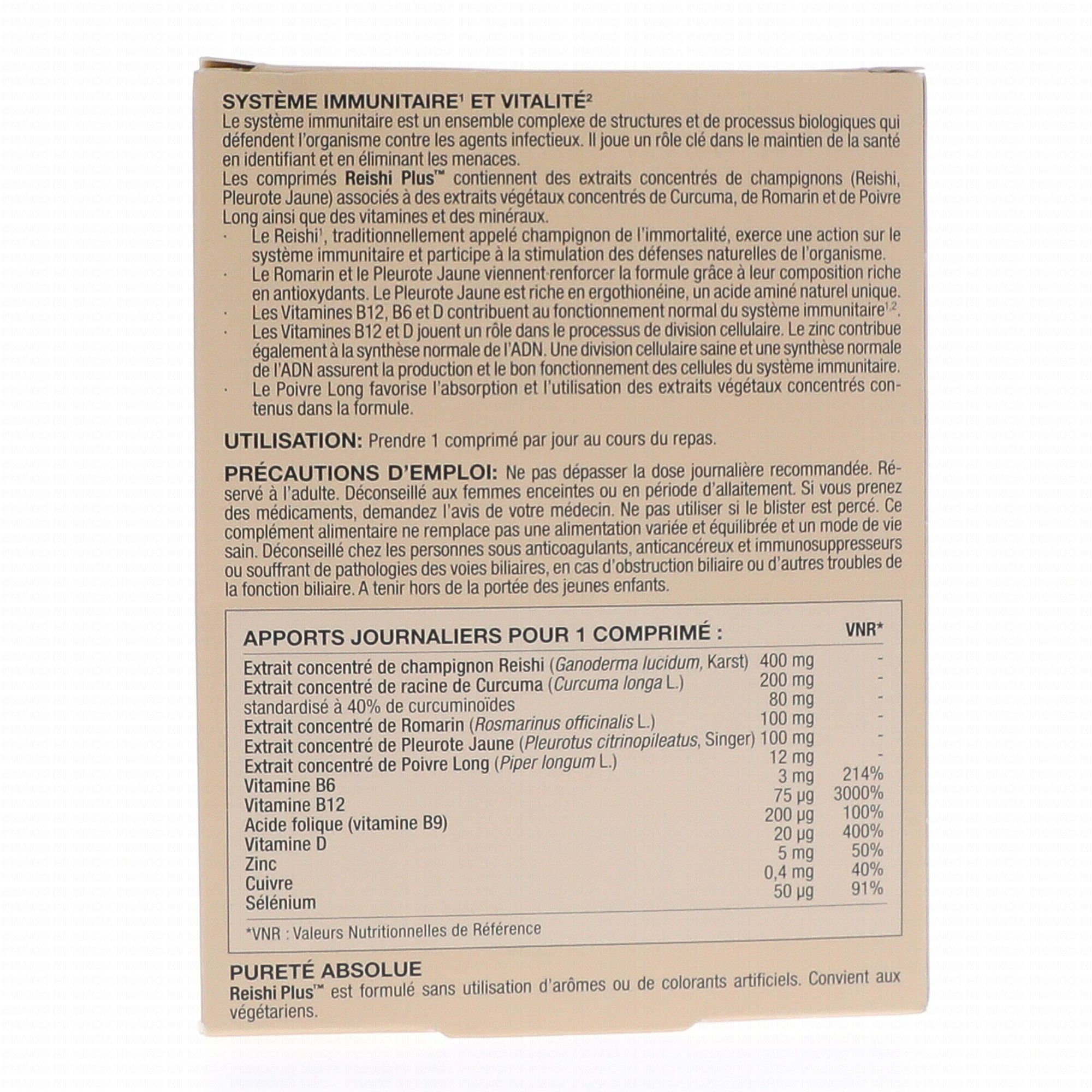Extrait de Reishi (Ganoderma lucidum Karst, Carpophore), agent de charge: carboonate de calcium, Extrait de curcuma (Curcuma longa L.) agent de charge: cellulose microcristalline, extrait de Romarin (Rosmarinus officinalis L.), extrait de Pleurote Jaune (Pleurotus citrinopileatus, Singer, Carpophore), anti-agglomérant: dioxyde de silicium, agent d'enrobage: sels de magnésium d'acides gras végétaux, agent de charge: carboxyméthylcellulose de sodium réticulée, malate de zinc, agent d'enrobage: hydroxypropylméthylcellulose, extrait de poivre long (piper iongum L), L-sélénométhionine, cholécalciférol (vitamine D), méthylcobalamine (vitamine B12), chlorhydrate de pyridoxine (vitamine B6), gluconate de cuivre, agent d'enrobage: glycérol, acide ptéroymonoglutamique (vitamine B9)