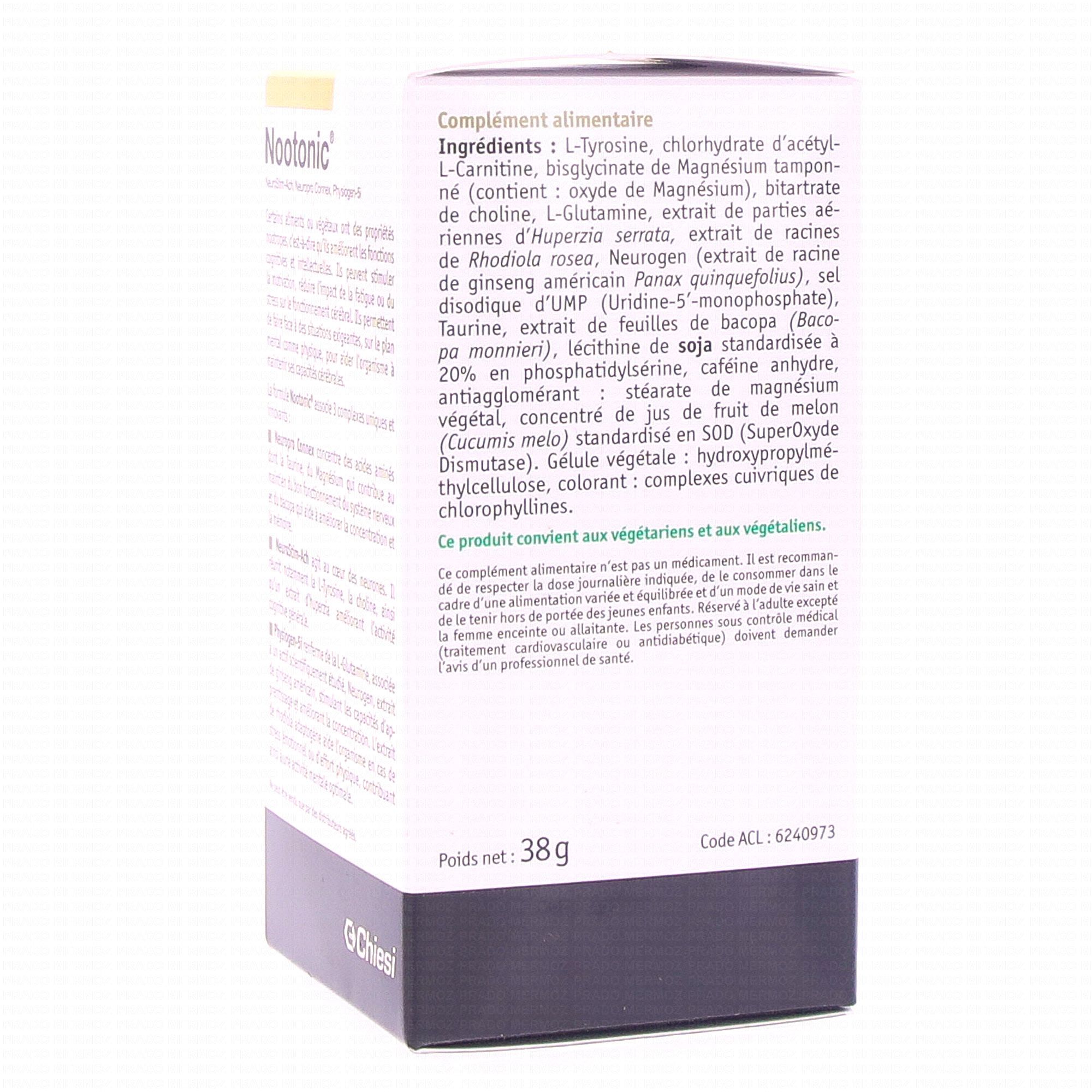 L-Tyrosine, chlorhydrate d'Acétyl-L-Carnitine, bisglycinate de Magnésium tamponné, bitartrate de choline, L-Glutamine, extrait de parties aériennes d'Huperzia serrata, extrait de racines de Rhodiola rosea, Neurogen™ (extrait de racines de ginseng américain Panax quinquefolius), sel disodique d'UMP (Uridine-5'-monophosphate), taurine, extrait de feuilles de bacopa (Bacopa monnieri), lécithine de soja standardisée à 20% en phosphatidylsérine, caféine anhydre, antiagglomérant : stéarate de magnésium végétal, concentré de jus de fruit de melon (Cucumis melo) standardisé en SOD (SuperOxyde Dismutase). Gélule : hydroxypropylméthylcellulose, colorant : complexes cuivriques de chlorophyllines.