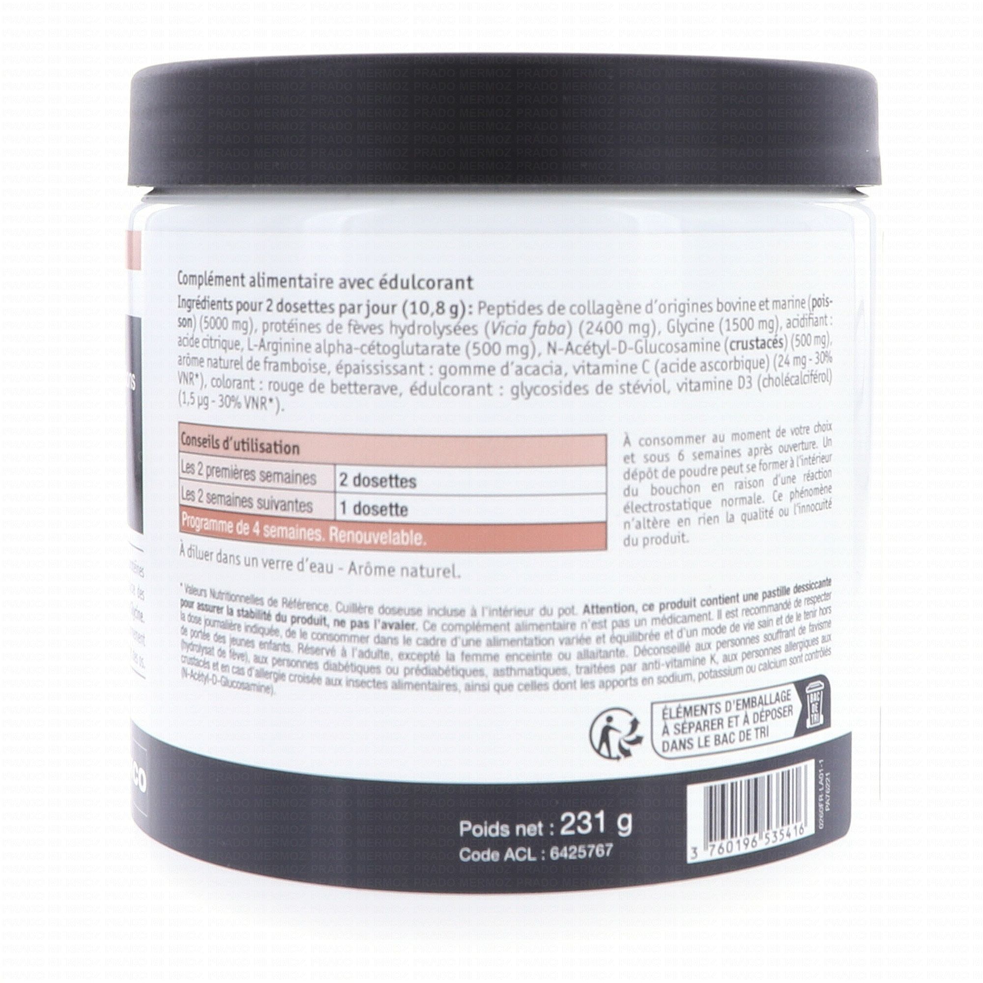 Peptides de collagène d'origines bovine et marine (poisson), protéines de fèves hydrolysées (Vicia faba), Glycine, acidifiant : acide citrique, L-Arginine alpha-cétoglutarate, N-Acétyl-D-Glucosamine (crustacés), arôme naturel de framboise, épaississant : gomme d'acacia, vitamine C (acide ascorbique), colorant : rouge de betterave, édulcorant : glycosides de stéviol, vitamine D3 (cholécalciférol).