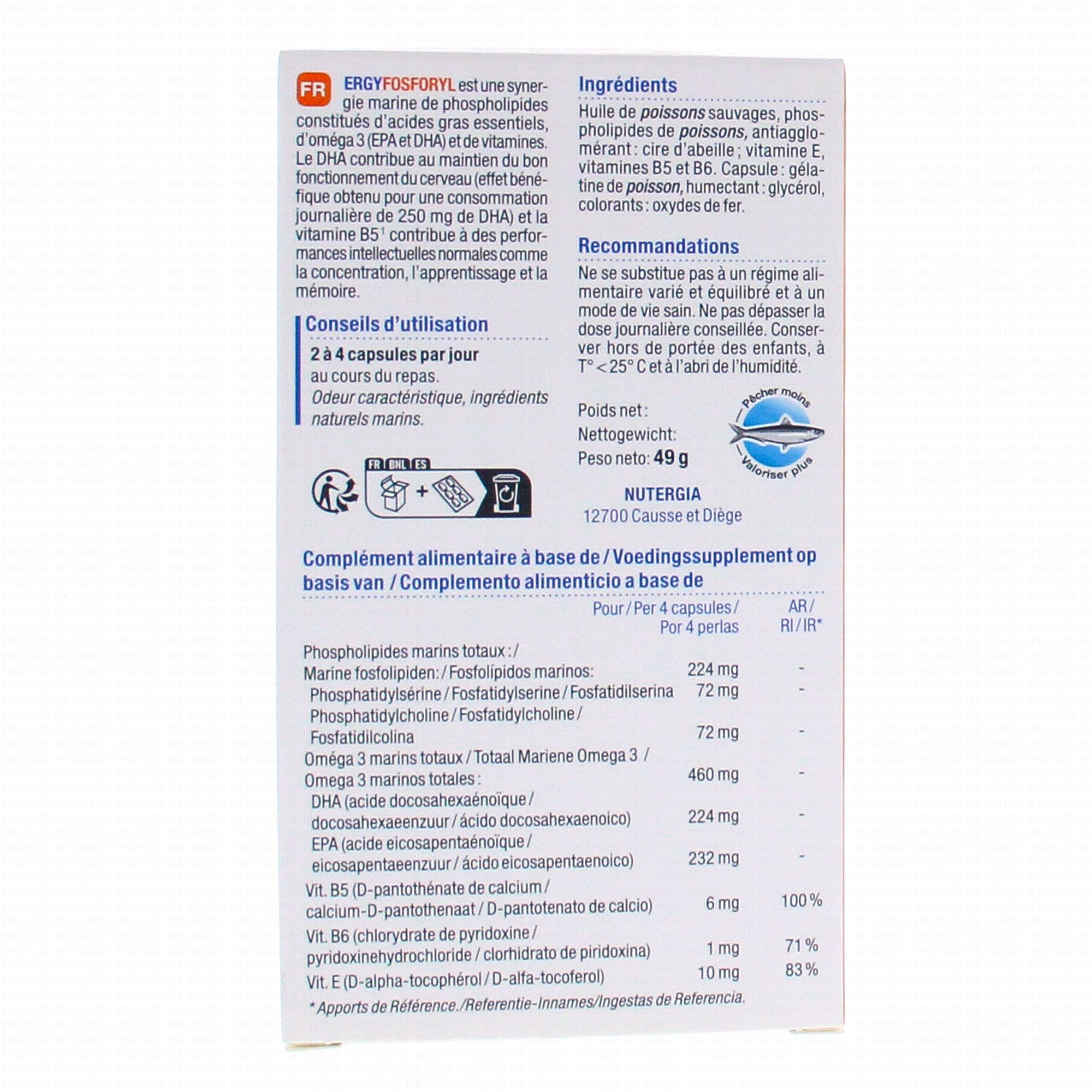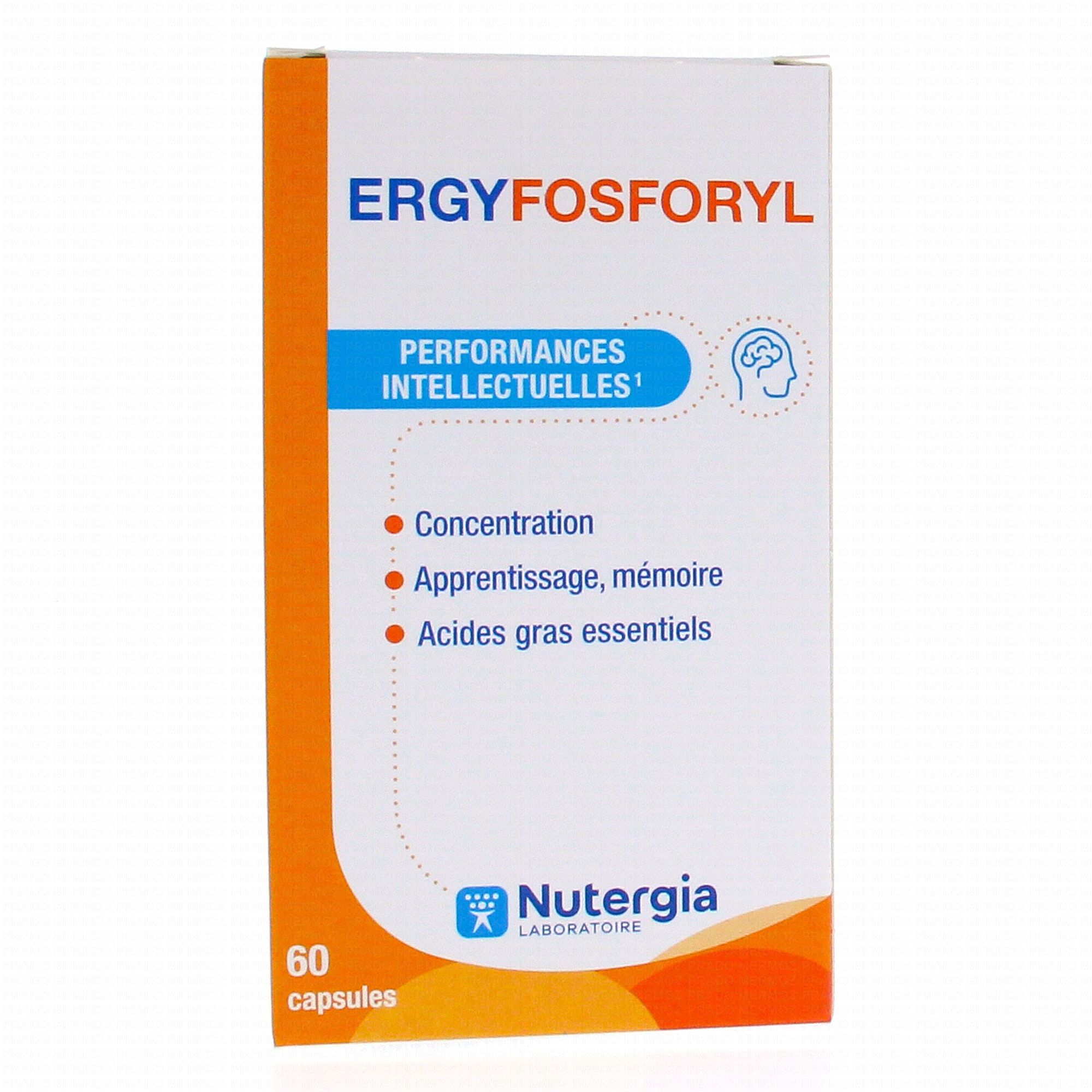 NUTERGIA Ergyfosforyl est un complément alimentaire riche en phospholipides et oméga 3 qui sont des constituants essentiels des membranes des neurones. Le DHA soutient le fonctionnement normal du cerveau en particulier les fonctions cognitives.