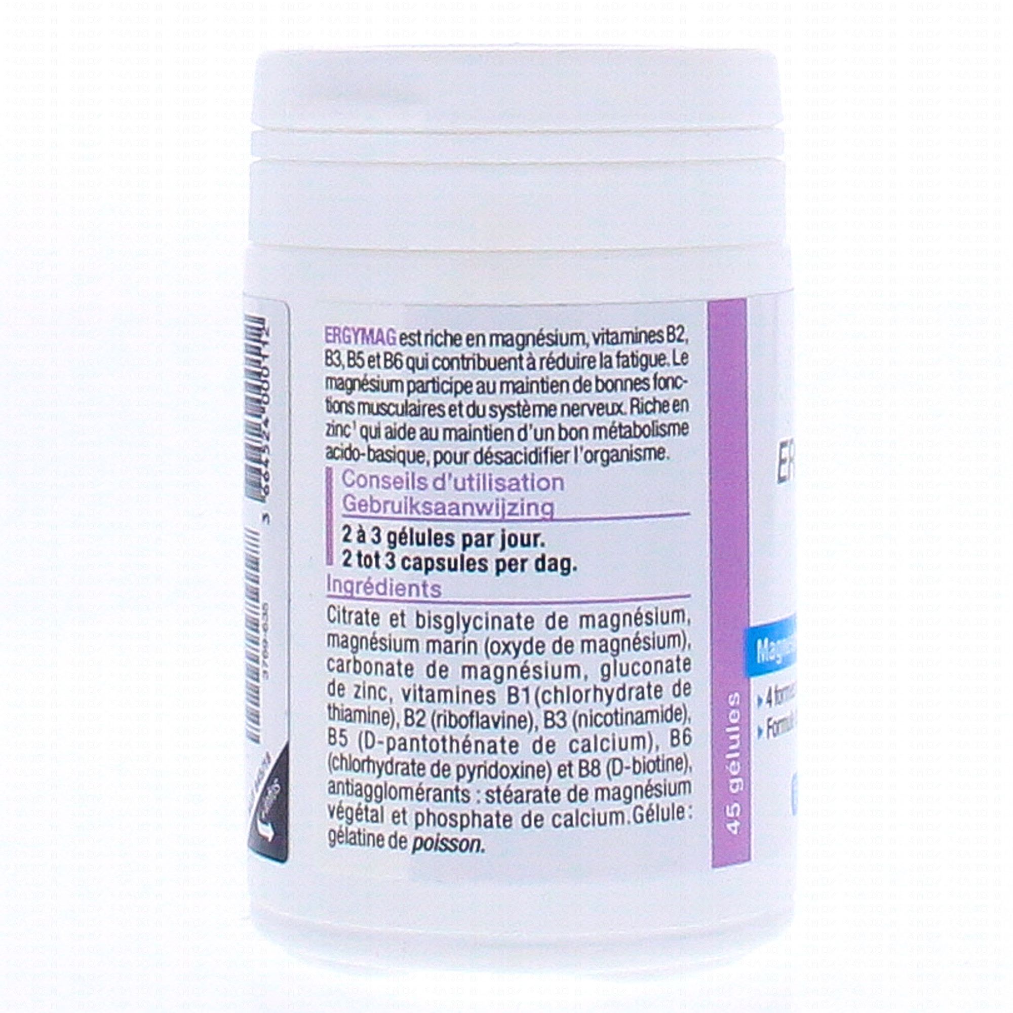Citrate et bisglycinate de magnésium, magnésium marin (oxyde de magnésium), carbonate de magnésium, gluconate de zinc, vitamines B1, B2, B3, B5, B6 et B8, antiagglomérants, stéarate de magnésium végétal et phosphate de calcium, gélule : gélatine de poisson.