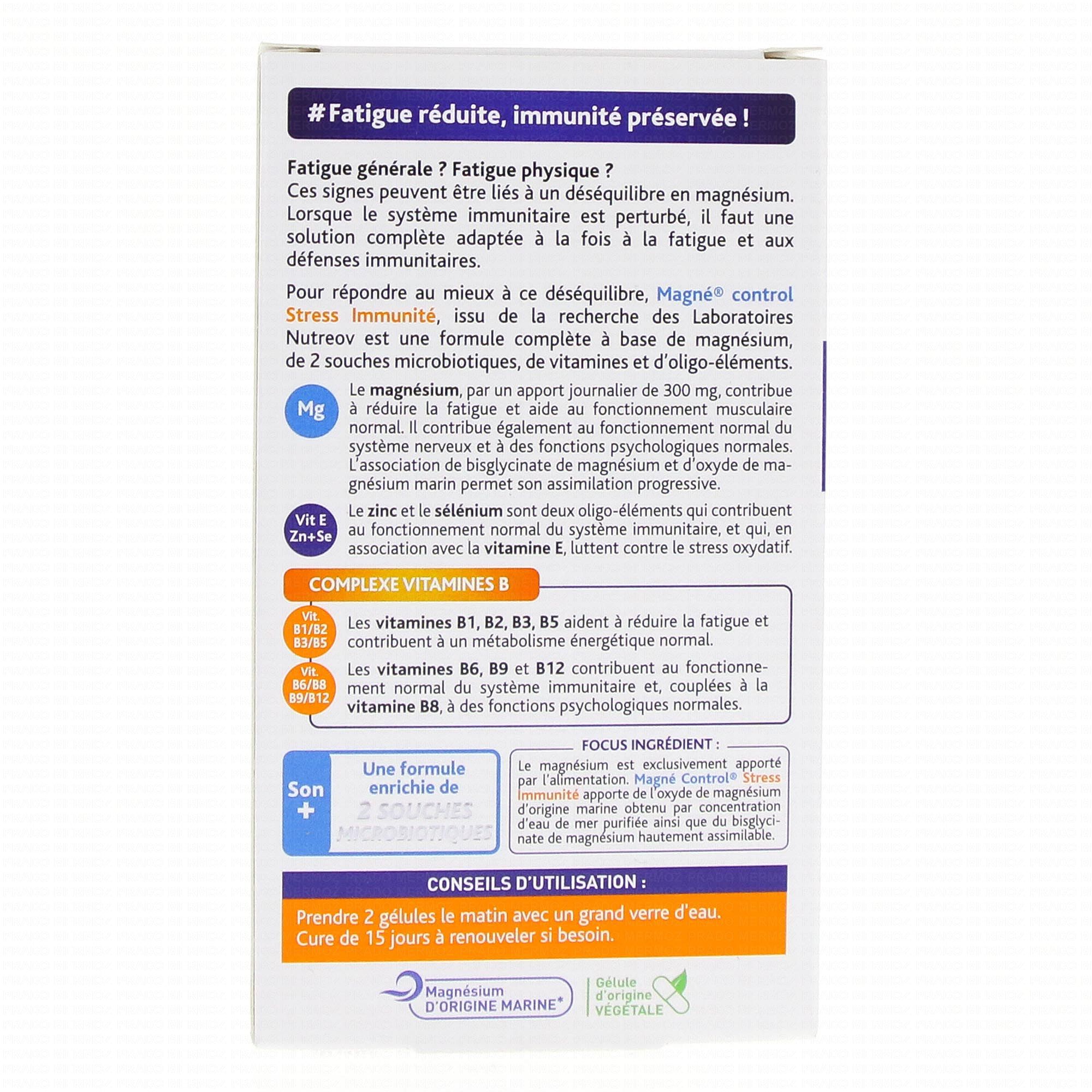 NUTREOV Magné Control Stress Immunité x30 Gélules est un complément alimentaire qui contribue à réduire la fatigue grâce à la présence de Magnésium et des vitamines B2, B3, B5 et B12. Le Sélénium, le Zinc et les vitamines B6, B9 et B12 aident à renforcer le système immunitaire.