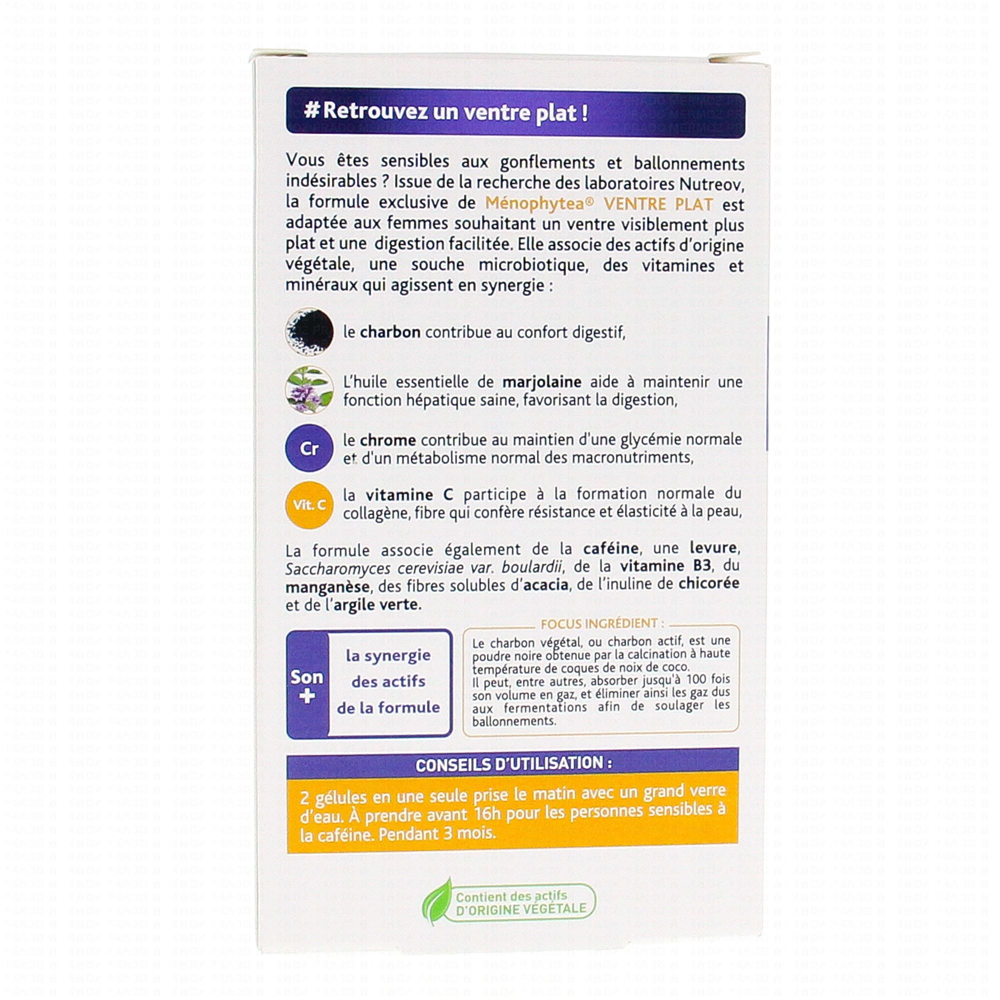 Nutreov Ménophytea Silhouette Ventre Plat 30 Gélules est un complément alimentaire à la formule exclusive est adaptée aux femmes souhaitant un ventre visiblement plus plat et contribue au confort digestif.
