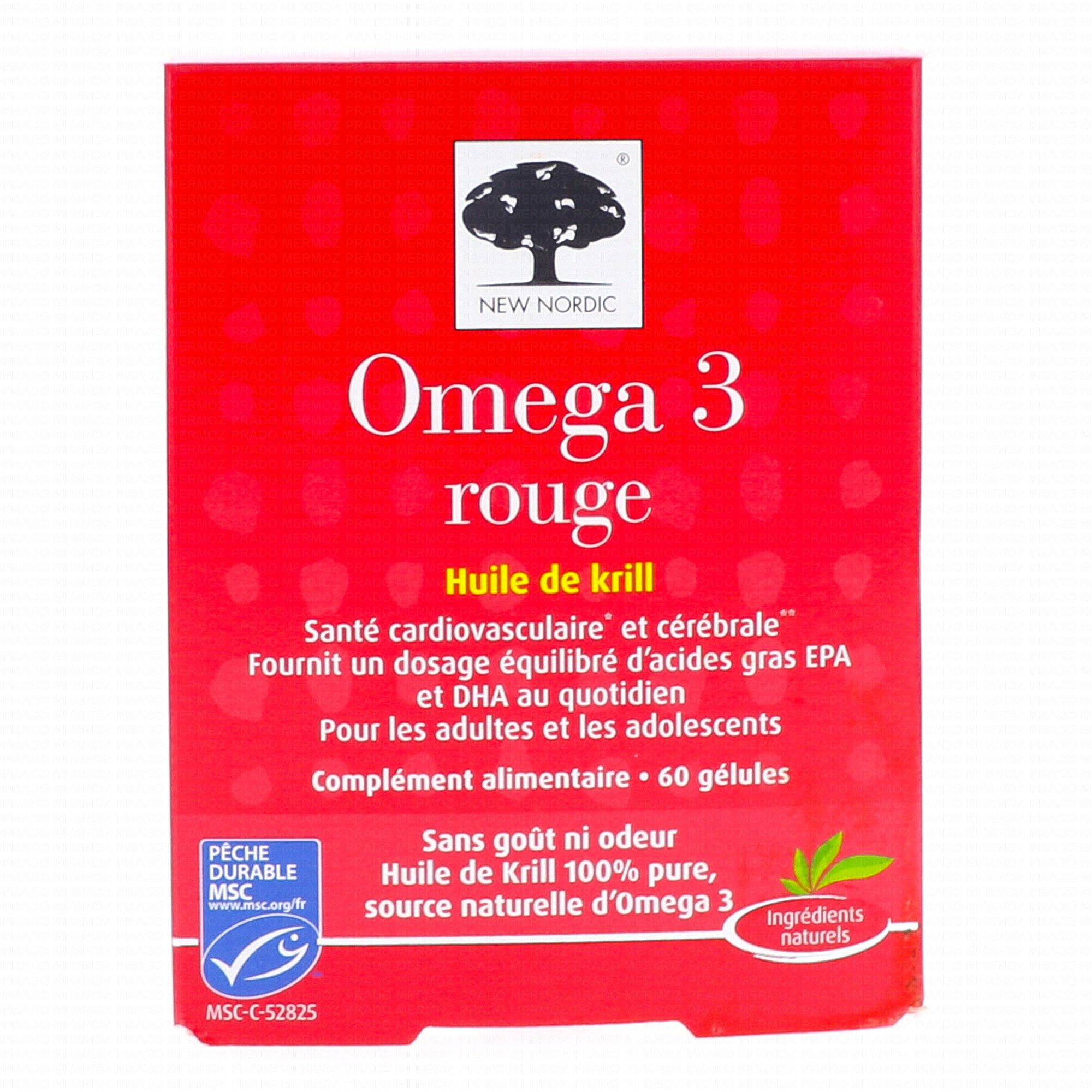 New Nordic Omega 3 rouge Huile de Krill x60 capsules est un complément alimentaire qui contribue à la santé cardiovasculaire et cérébrale grâce à la présence d' Acide docosahexaénoïque et d'Acide eicosapentaénoïque